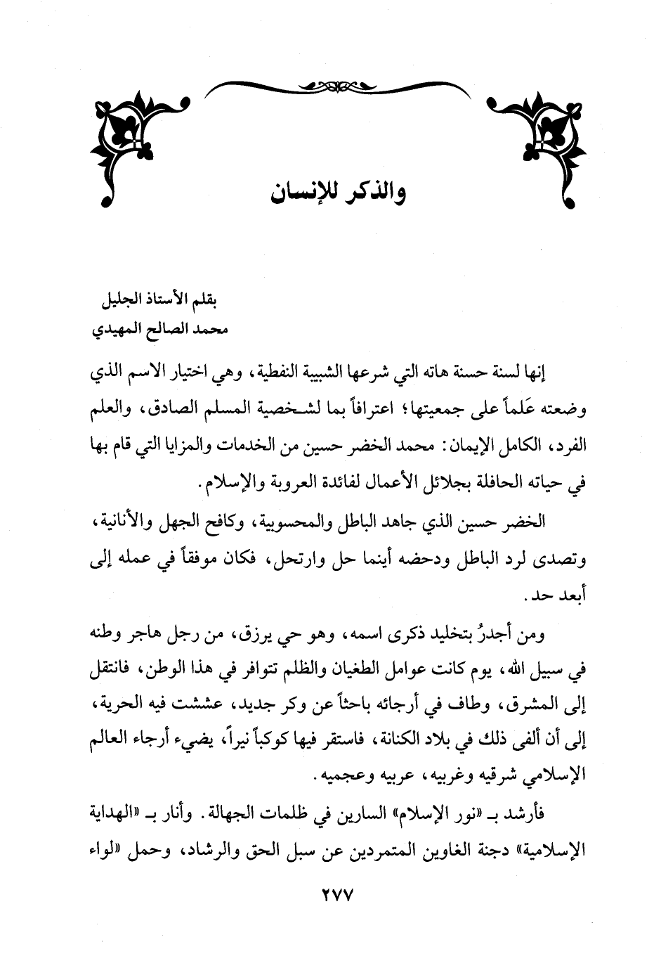 الخضر حسين الذي جاهد الباطل والمحسوبية، وكافح الجهل والأنانية، وتصدى لرد الباطل ودحضه أينما حل وارتحل، فكان موفقاً في عمله إلى أبعد حد.