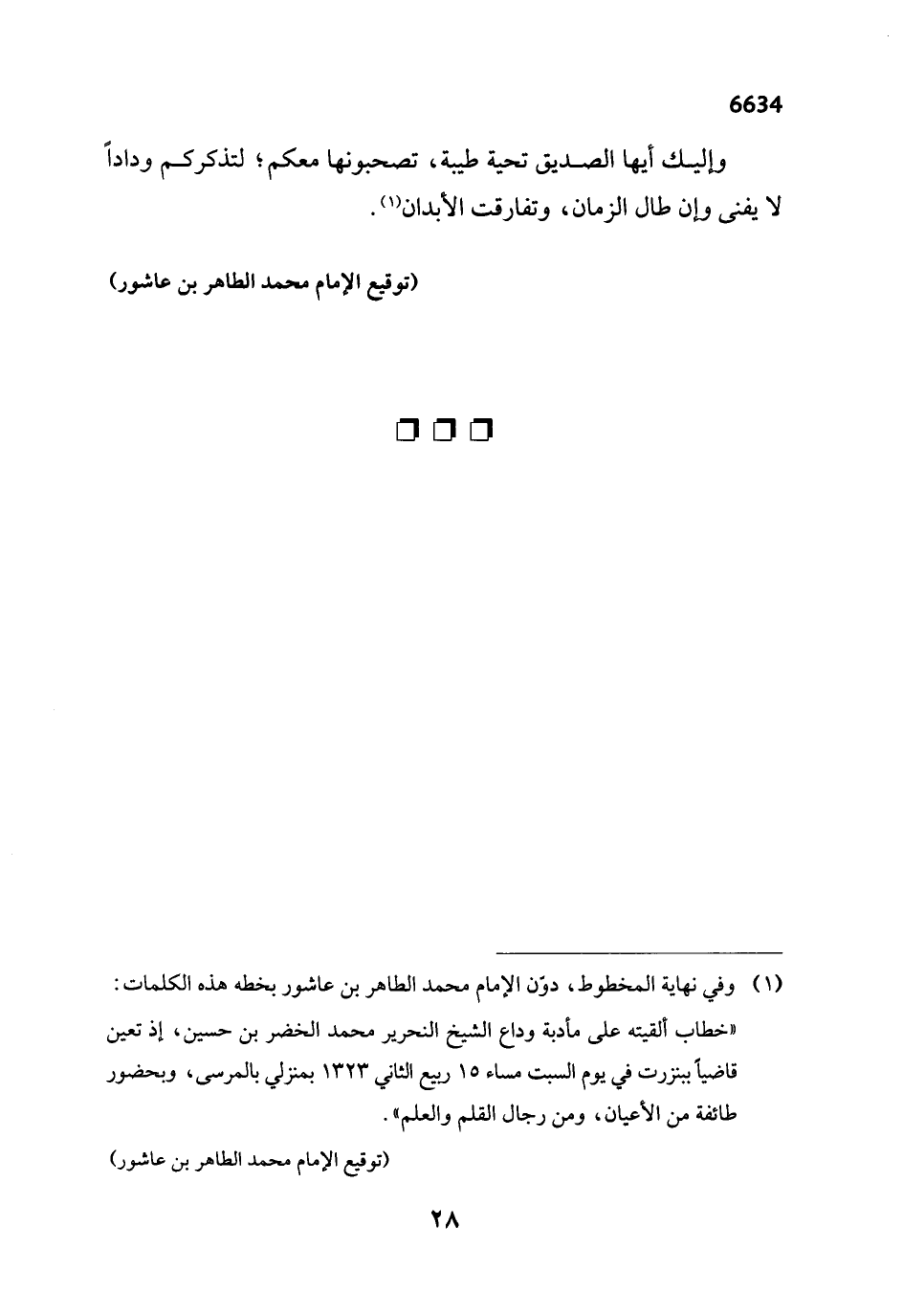 (¬1) وفي نهاية المخطوط، دوّن الإمام محمد الطاهر بن عاشور بخطه هذه الكلمات: "خطاب ألقيته على مأدبة ودل الشيخ النحرير محمد الخضر بن حسين، إذ تعين قاضياً ببنزرت في يوم السبت مساء 15 ربيع الثاني 1323 بمنزلي بالمرسى، وبحضور طائفة من الأعيان، ومن رجال القلم والعلم".