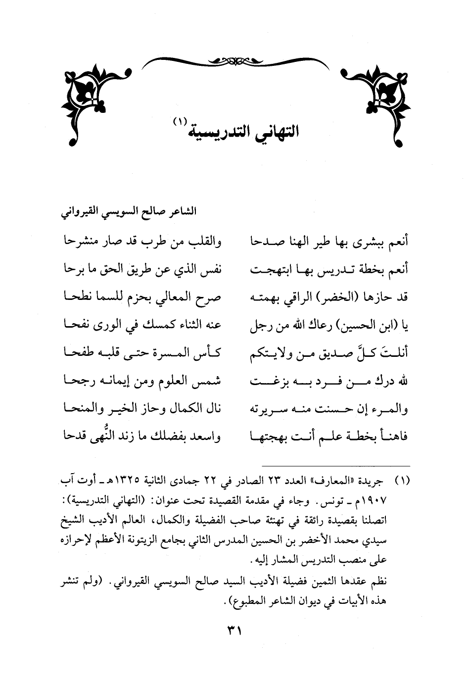 (¬1) جريدة "المعارف" العدد 23 الصادر في 22 جمادى الثانية 1325 هـ - أوت آب 1907 م - تونس. وجاء في مقدمة القصيدة تحت عنوان: (التهاني التدريسية): اتصلنا بقصيدة رائقة في تهنئة صاحب الفضيلة والكمال، العالم الأديب الشيخ سيدي محمد الأخضر بن الحسين المدرس الثاني بجامع الزيتونة الأعظم لإحرازه على منصب التدريس المشار إليه.