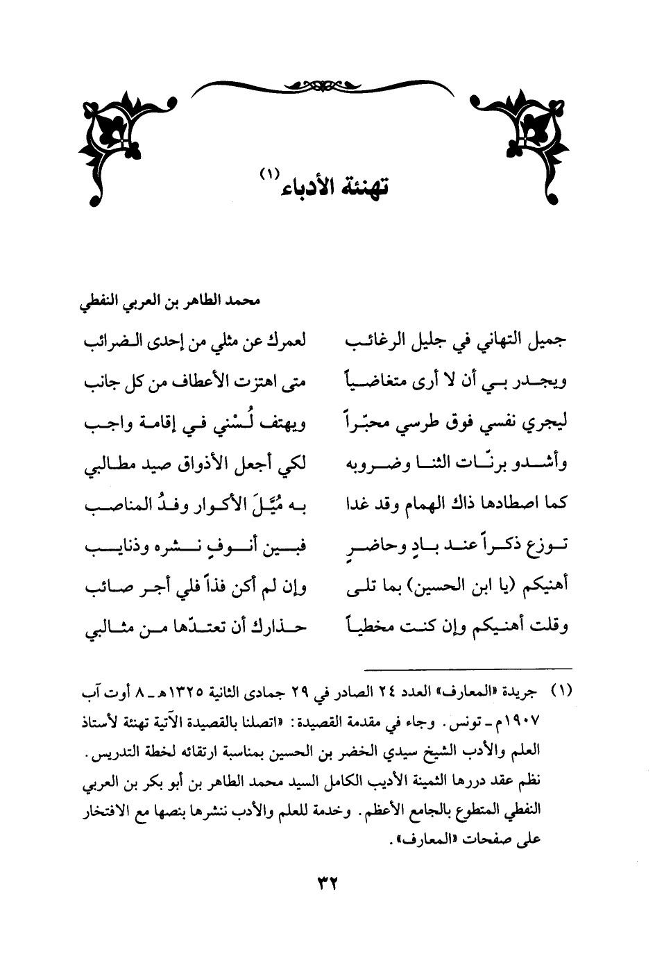 (¬1) جريدة "المعارف" العدد 24 الصادر في 29 جمادى الثانية 1325 هـ - 8 أوت آب 1907 م - تونس. وجاء في مقدمة القصيدة: "اتصلنا بالقصيدة الآتية تهنئة لأستاذ العلم والأدب الشيخ سيدي الخضر بن الحسين بمناسبة ارتقائه لخطة التدريس. نظم عقد دررها الثمينة الأديب الكامل السيد محمد الطاهر بن أبو بكر بن العربي النفطي المتطوع بالجامع الأعظم. وخدمة للعلم والأدب ننشرها بنصها مع الافتخار على صفحات "المعارف".