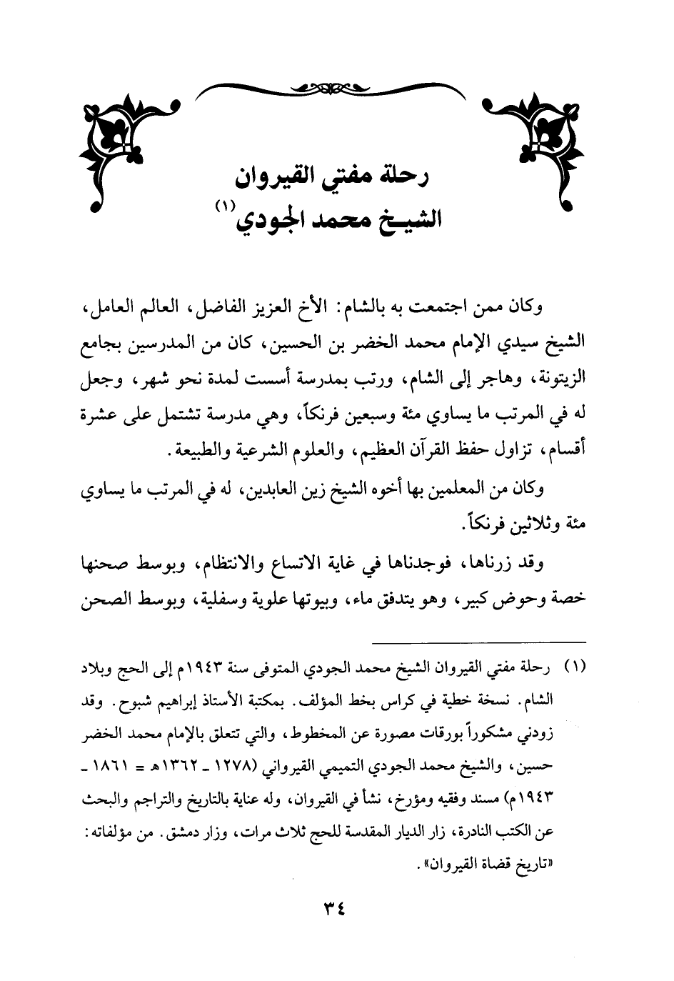 (¬1) رحلة مفتي القيروان الشيخ محمد الجودي المتوفى سنة 1943 م إلى الحج وبلاد الشام. نسخة خطية في كراس بخط المؤلف. بمكتبة الأستاذ إبراهيم شبوح. وقد زودني مشكوراً بورقات مصورة عن المخطوط، والتي تتعلق بالإمام محمد الخضر حسين، والشيخ محمد الجودي التميمي القيرواني (1278 - 1362 هـ = 1861 - 1943 م) مسند وفقيه ومؤرخ، نشأ في القيروان، وله عناية بالتاريخ والتراجم والبحث عن الكتب النادرة، زار الديار المقدسة للحج ثلاث مرات، وزار دمشق. من مؤلفاته: "تاريخ قضاة القيروان".