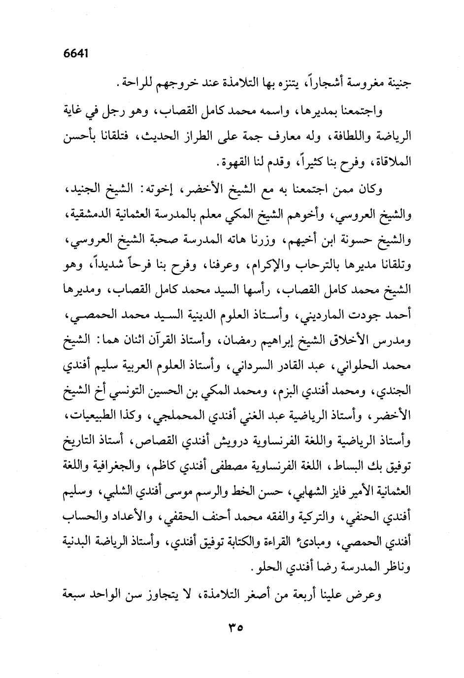 وكان ممن اجتمعنا به مع الشيخ الأخضر، إخوته: الشيخ الجنيد، والشيخ العروسي، وأخوهم الشيخ المكي معلم بالمدرسة العثمانية الدمشقية، والشيخ حسونة ابن أخيهم، وزرنا هاته المدرسة صحبة الشيخ العروسي، وتلقانا مديرها بالترحاب والإكرام، وعرفنا، وفرح بنا فرحاً شديداً، وهو الشيخ محمد كامل القصاب، رأسها السيد محمد كامل القصاب، ومديرها أحمد جودت المارديني، وأستاذ العلوم الدينية السيد محمد الحمصي، ومدرس الأخلاق الشيخ إبراهيم رمضان، وأستاذ القرآن اثنان هما: الشيخ محمد الحلواني، عبد القادر السرداني، وأستاذ العلوم العربية سليم أفندي الجندي، ومحمد أفندي البزم، ومحمد المكي بن الحسين التونسي أخ الشيخ الأخضر، وأستاذ الرياضية عبد الغني أفندي المحملجي، وكذا الطبيعيات، وأستاذ الرياضية واللغة الفرنساوية درويش أفندي القصاص، أستاذ التاريخ توفيق بك البساط، اللغة الفرنساوية مصطفى أفندي كاظم، والجغرافية واللغة العثمانية الأمير فايز الشهابي، حسن الخط والرسم موسى أفندي الشلبي، وسليم أفندي الحنفي، والتركية والفقه محمد أحنف الحقفي، والأعداد والحساب أفندي الحمصي، ومبادئ القراءة والكتابة توفيق أفندي، وأستاذ الرياضة البدنية وناظر المدرسة رضا أفندي الحلو.