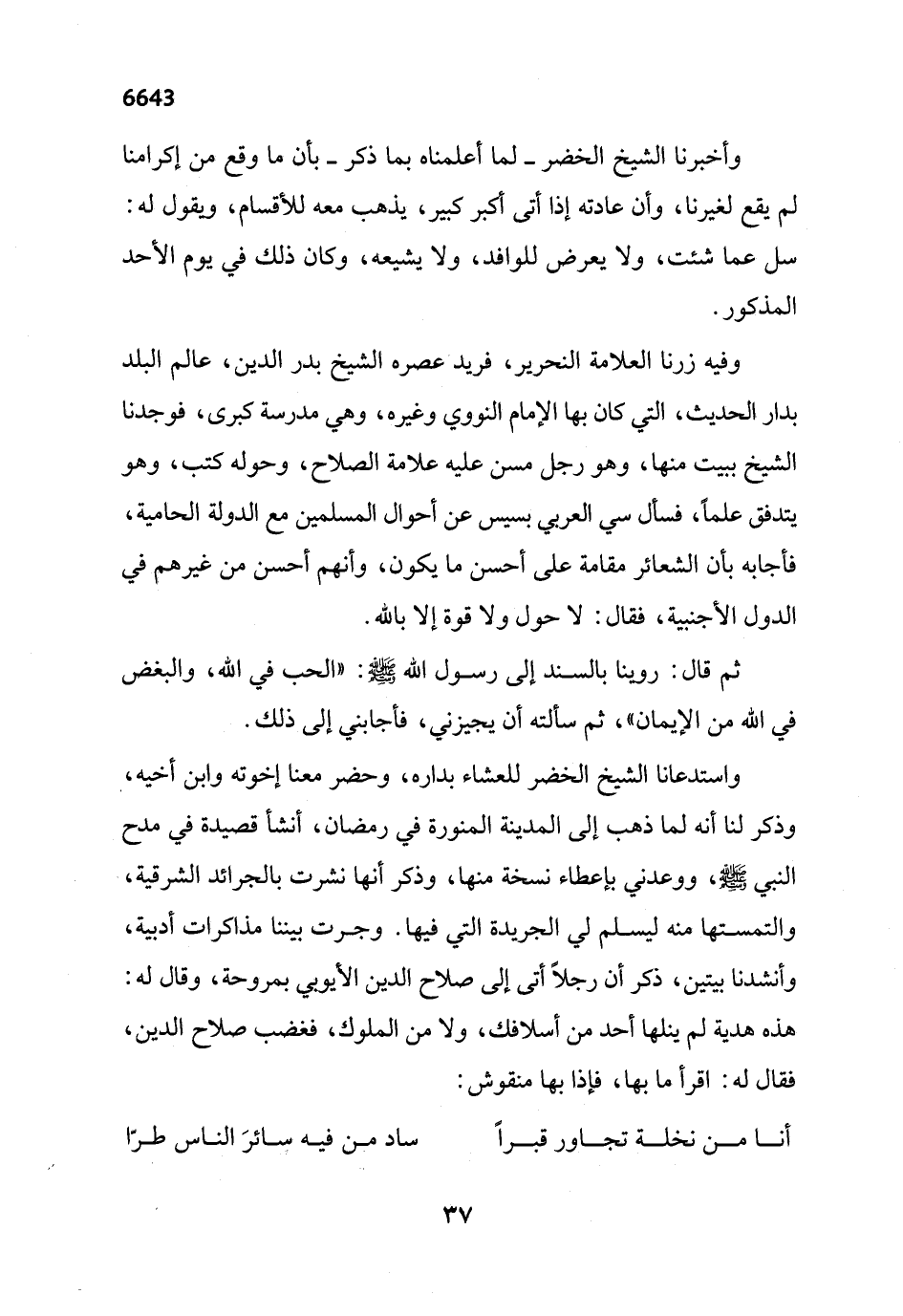 واستدعانا الشيخ الخضر للعشاء بداره، وحضر معنا إخوته وابن أخيه، وذكر لنا أنه لما ذهب إلى المدينة المنورة في رمضان، أنشأ قصيدة في مدح النبي - صلى الله عليه وسلم -، ووعدني بإعطاء نسخة منها، وذكر أنها نشرت بالجرائد الشرقية، والتمستها منه ليسلم لي الجريدة التي فيها. وجرت بيننا مذاكرات أدبية، وأنشدنا بيتين، ذكر أن رجلاً أتى إلى صلاح الدين الأيوبي بمروحة، وقال له: هذه هدية لم ينلها أحد من أسلافك، ولا من الملوك، فغضب صلاح الدين، فقال له: اقرأ ما بها، فإذا بها منقوش: