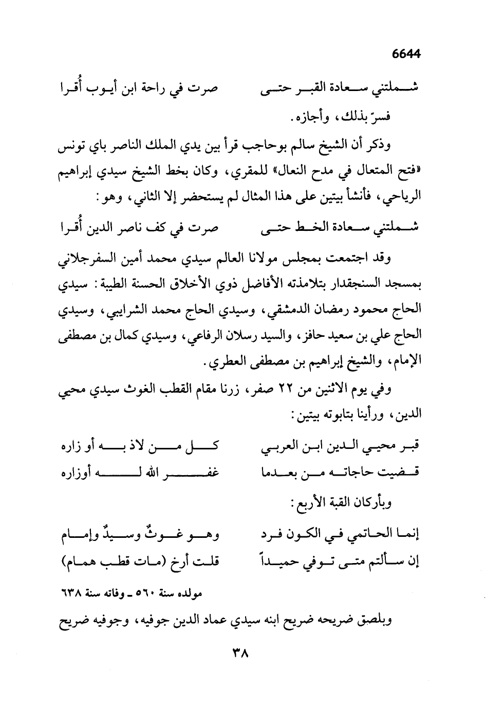 وفي يوم الاثنين من 22 صفر، زرنا مقام القطب الغوث سيدي محيي الدين، ورأينا بتابوته بيتين: