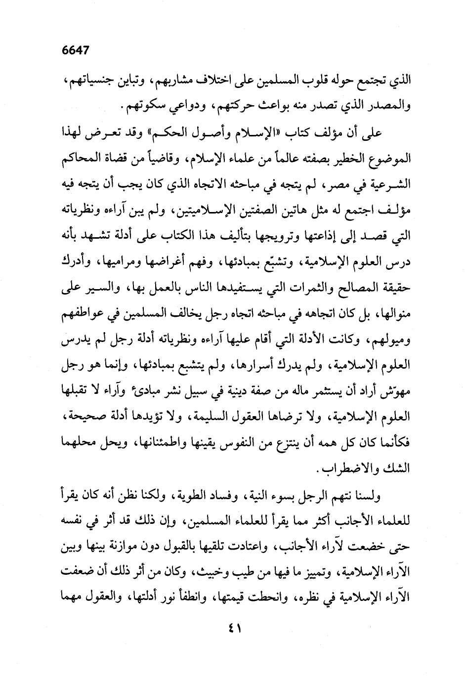 على أن مؤلف كتاب "الإسلام وأصول الحكم" وقد تعرض لهذا الموضوع الخطير بصفمَه عالماً من علماء الإِسلام، وقاضياً من قضاة المحاكم الشرعية في مصر، لم يتجه في مباحثه الاتجاه الذي كان يجب أن يتجه فيه مؤلف اجتمع له مثل هاتين الصفتين الإسلاميتين، ولم يبن آراءه ونظرياته التي قصد إلى إذاعتها وترويجها بتأليف هذا الكتاب على أدلة تشهد بأنه درس العلوم الإسلامية، وتشبّع بمبادئها، وفهم أغراضها ومراميها، وأدرك حقيقة المصالح والثمرات التي يستفيدها الناس بالعمل بها، والسير على منوالها، بل كان اتجاهه في مباحثه اتجاه رجل يخالف المسلمين في عواطفهم وميولهم، وكانت الأدلة التي أقام عليها آراءه ونظرياته أدلة رجل لم يدرس العلوم الإِسلامية، ولم يدرك أسرارها, ولم يتشبع بمبادئها، وإنما هو رجل مهوّش أراد أن يستثمر ماله من صفة دينية في سبيل نشر مبادئ وآراء لا تقبلها العلوم الإسلامية، ولا ترضاها العقول السليمة، ولا تؤيدها أدلة صحيحة، فكأنما كان كل همه أن ينتزع من النفوس يقينها واطمئنانها، ويحل محلهما الشك والاضطراب.