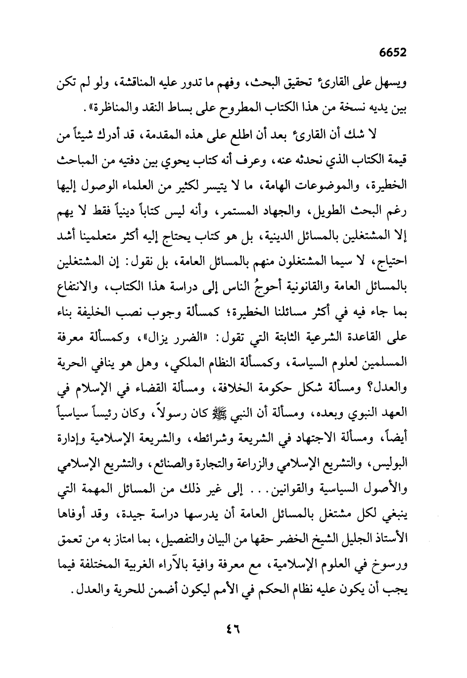 لا شك أن القارئ بعد أن اطلع على هذه المقدمة، قد أدرك شيئاً من قيمة الكتاب الذي نحدثه عنه، وعرف أنه كتاب يحوي بين دفتيه من المباحث الخطيرة، والموضوعات الهامة، ما لا يتيسر لكثير من العلماء الوصول إليها رغم البحث الطويل، والجهاد المستمر، وأنه ليس كتاباً دينياً فقط لا يهم إلا المشتغلين بالمسائل الدينية، بل هو كتاب يحتاج إليه أكثر متعلمينا أشد احتياج، لا سيما المشتغلون منهم بالمسائل العامة، بل نقول: إن المشتغلين بالمسائل العامة والقانونية أحوجُ الناس إلى دراسة هذا الكتاب، والانتفاع بما جاء فيه في أكثر مسائلنا الخطيرة؛ كمسألة وجوب نصب الخليفة بناء على القاعدة الشرعية الثابتة التي تقول: "الضرر يزال"، وكمسألة معرفة المسلمين لعلوم السياسة، وكمسألة النظام الملكي، وهل هو ينافي الحرية والعدل؟ ومسألة شكل حكومة الخلافة، ومسألة القضاء في الإسلام في العهد النبوي وبعده، ومسألة أن النبي - صلى الله عليه وسلم - كان رسولاً، وكان رئيساً سياسياً أيضاً، ومسألة الاجتهاد في الشريعة وشرائطه، والشريعة الإسلامية وإدارة البوليس، والتشريع الإسلامي والزراعة والتجارة والصنائع، والتشريع الإِسلامي والأصول السياسية والقوانين ... إلى غير ذلك من المسائل المهمة التي ينبغي لكل مشتغل بالمسائل العامة أن يدرسها دراسة جيدة، وقد أوفاها الأستاذ الجليل الشيخ الخضر حقها من البيان والتفصيل، بما امتاز به من تعمق ورسوخ في العلوم الإسلامية، مع معرفة وافية بالآراء الغربية المختلفة فيما يجب أن يكون عليه نظام الحكم في الأمم ليكون أضمن للحرية والعدل.