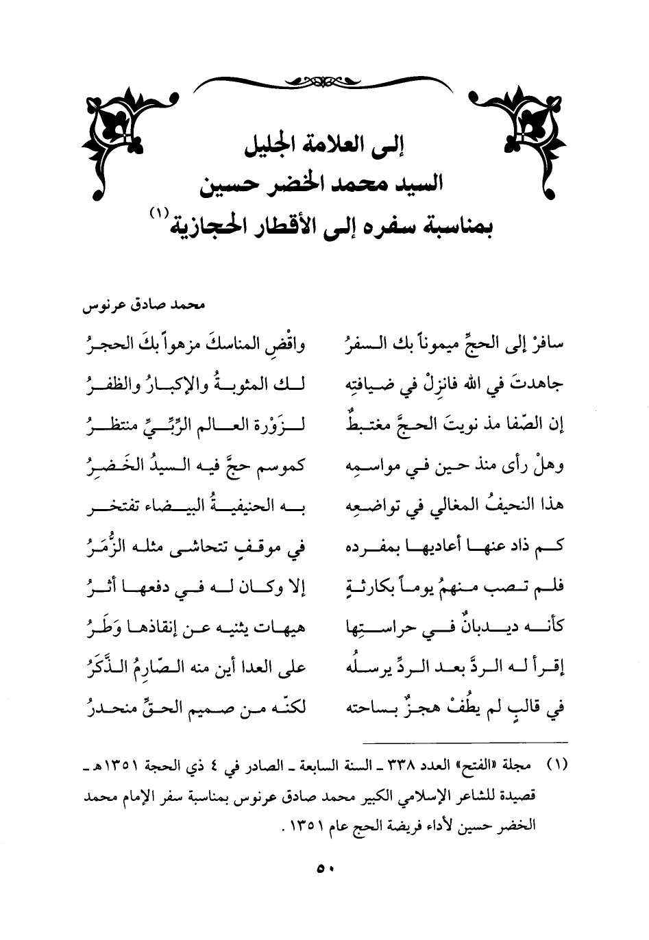 (¬1) مجلة "الفتح" العدد 338 - السنة السابعة - الصادر في 4 ذي الحجة 1351 هـ - قصيدة للشاعر الإسلامي الكبير محمد صادق عرنوس بمناسبة سفر الإمام محمد الخضر حسين لأداء فريضة الحج عام 1351.