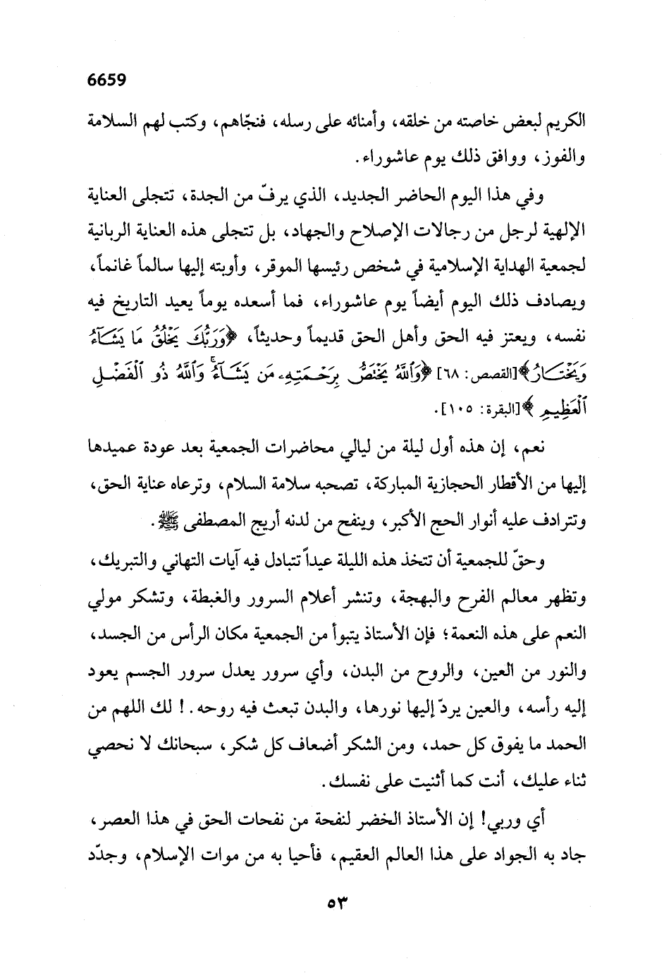 وفي هذا اليوم الحاضر الجديد، الذي يرفّ من الجدة، تتجلى العناية الإلهية لرجل من رجالات الإصلاح والجهاد، بل تتجلى هذه العناية الربانية لجمعية الهداية الإسلامية في شخص رئيسها الموقر، وأوبته إليها سالماً غانماً، ويصادف ذلك اليوم أيضاً يوم عاشوراء، فما أسعده يوماً يعيد التاريخ فيه نفسه، ويعتز فيه الحق وأهل الحق قديمًا وحديثا، {وَرَبُّكَ يَخْلُقُ مَا يَشَاءُ وَيَخْتَارُ} [القصص: 68} [وَاللَّهُ يَخْتَصُّ بِرَحْمَتِهِ مَنْ يَشَاءُ وَاللَّهُ ذُو الْفَضْلِ الْعَظِيمِ} [البقرة: 105].