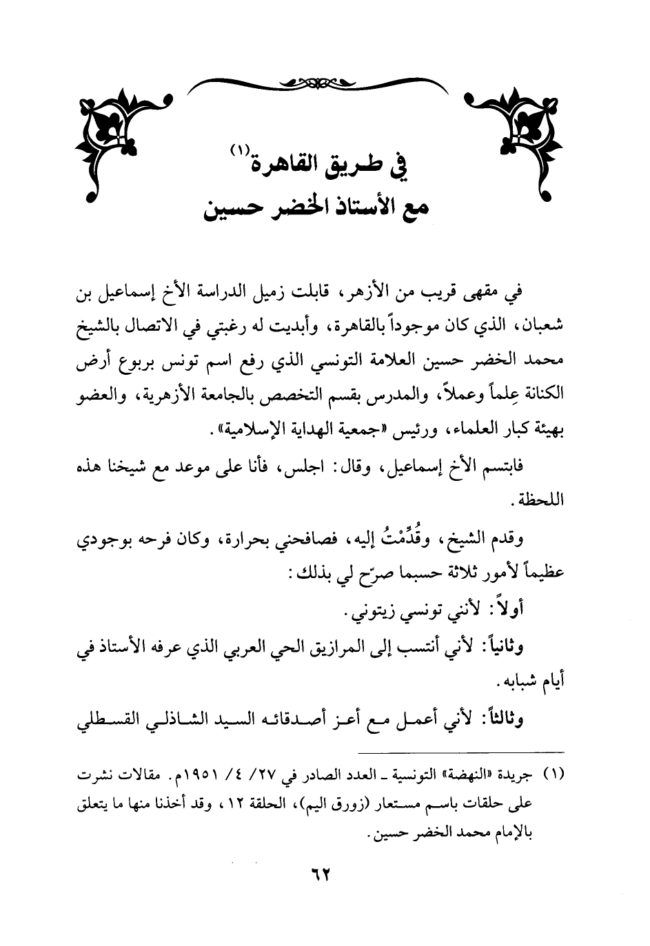 (¬1) جريدة "النهضة" التونسية - العدد الصادر في 27/ 4/ 1951 م. مقالات نشرت على حلقات باسم مستعار (زورق اليم)، الحلقة 12، وقد أخذنا منها ما يتعلق بالإمام محمد الخضر حسين.
