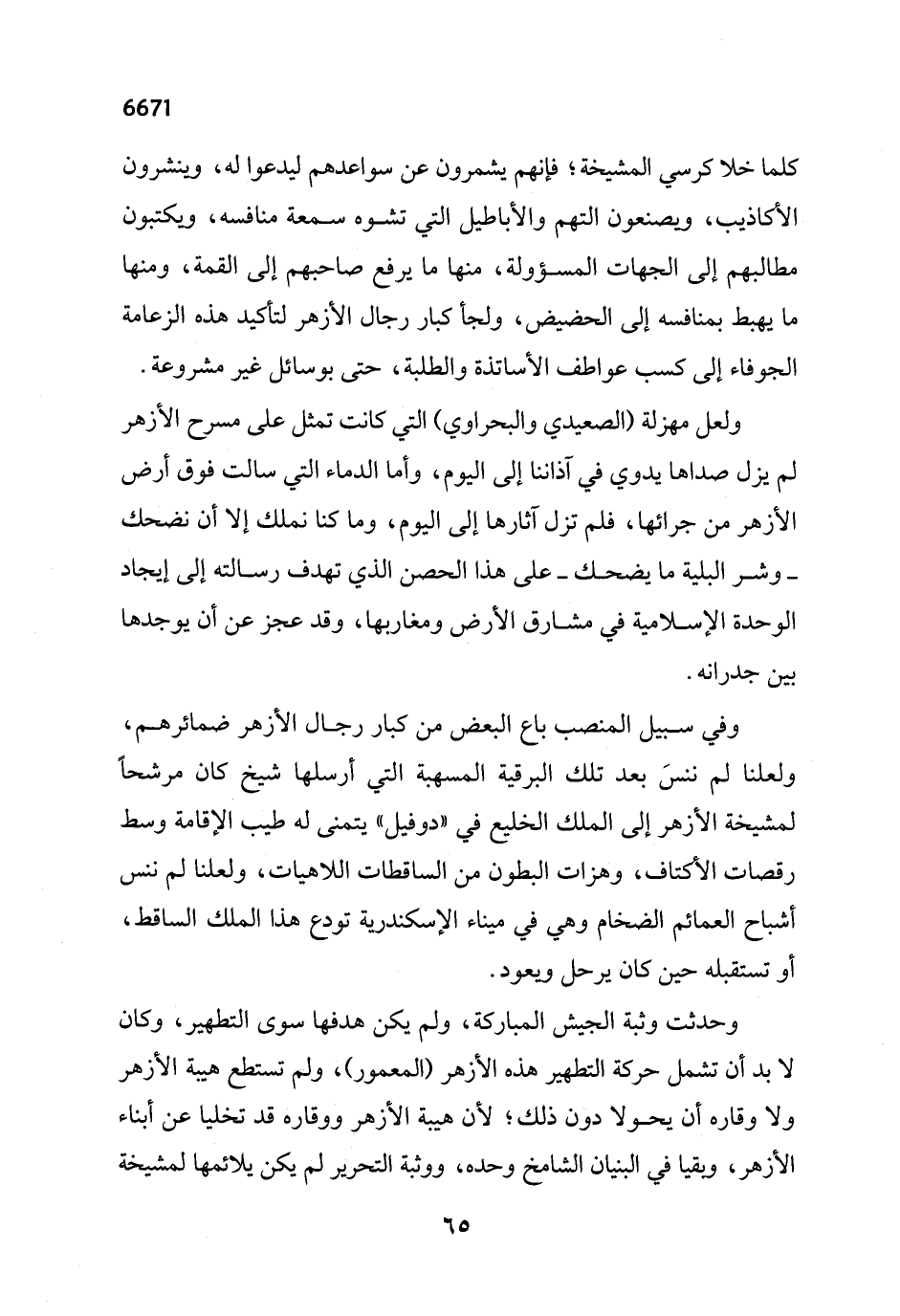وحدثت وثبة الجيش المباركة، ولم يكن هدفها سوى التطهير، وكان لا بد أن تشمل حركة التطهير هذه الأزهر (المعمور)، ولم تستطع هيبة الأزهر ولا وقاره أن يحولا دون ذلك؛ لأن هيبة الأزهر ووقاره قد تخليا عن أبناء الأزهر، وبقيا في البنيان الشامخ وحده، ووثبة التحرير لم يكن يلائمها لمشيخة