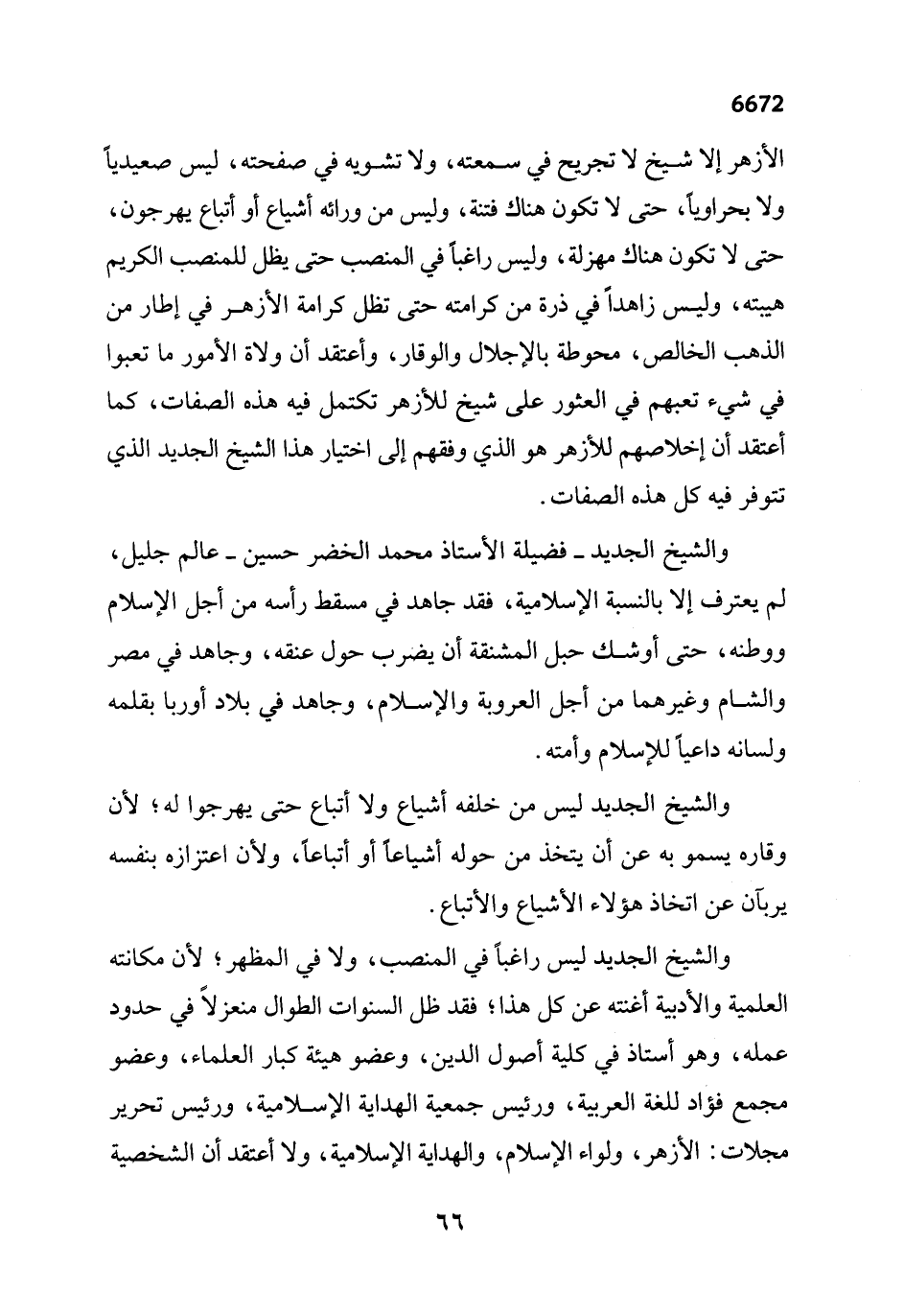الأزهر إلا شيخ لا تجريح في سمعته، ولا تشويه في صفحته، ليس صعيدياً ولا بحراوياً، حتى لا تكون هناك فتنة، وليس من ورائه أشياع أو أتباع يهرجون، حتى لا تكون هناك مهزلة، وليس راغباً في المنصب حتى يظل للمنصب الكريم هيبته، وليس زاهداً في ذرة من كرامته حتى تظل كرامة الأزهر في إطار من الذهب الخالص، محوطة بالإجلال والوقار، وأعتقد أن ولاة الأمور ما تعبوا في شيء تعبهم في العثور على شيخ للأزهر تكتمل فيه هذه الصفات، كما أعتقد أن إخلاصهم للأزهر هو الذي وفقهم إلى اختيار هذا الشيخ الجديد الذي تتوفر فيه كل هذه الصفات.