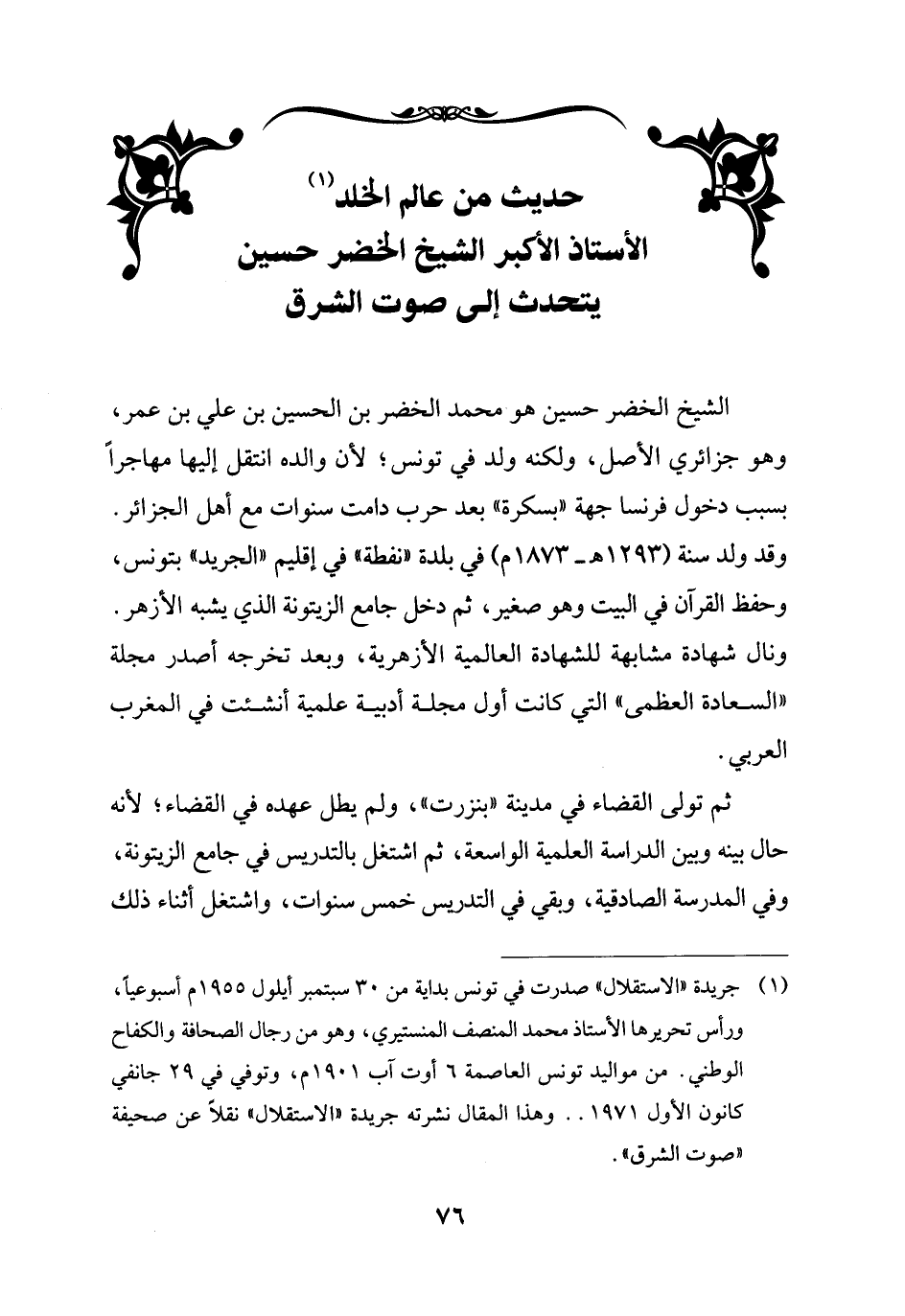 حديث من عالم الخلد (¬1) الأستاذ الأكبر الشيخ الخضر حسين يتحدث إلى صوت الشرق