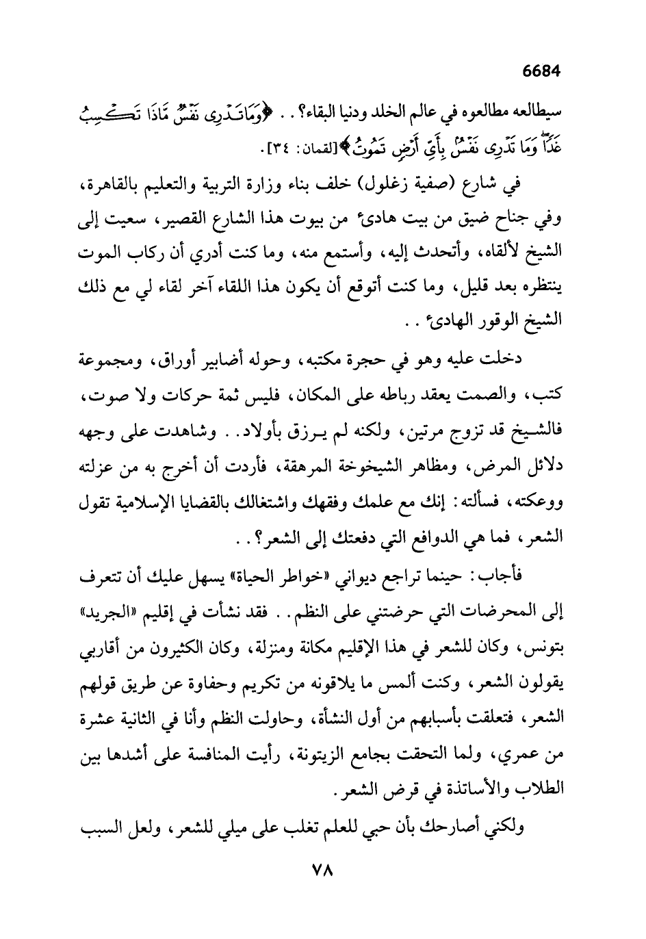 دخلت عليه وهو في حجرة مكتبه، وحوله أضابير أوراق، ومجموعة كتب، والصمت يعقد رباطه على المكان، فليس ثمة حركات ولا صوت، فالشيخ قد تزوج مرتين، ولكنه لم يرزق بأولاد .. وشاهدت على وجهه دلائل المرض، ومظاهر الشيخوخة المرهقة، فأردت أن أخرج به من عزلته ووعكته، فسألته: إنك مع علمك وفقهك واشتغالك بالقضايا الإسلامية تقول الشعر، فما هي الدوافع التي دفعتك إلى الشعر؟ ..