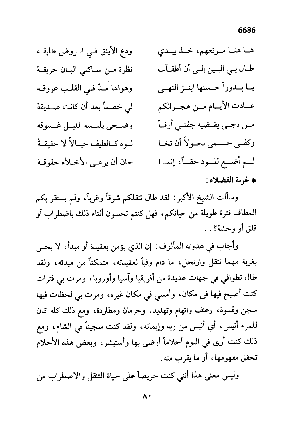 وأجاب في هدوئه المألوف: إن الذي يؤمن بعقيدة أو مبدأ، لا يحس بغربة مهما تنقل وارتحل، ما دام وفياً لعقيدته، متمكناً من مبدئه، ولقد طال تطوافي في جهات عديدة من أفريقيا وآسيا وأوروبا، ومرت بي فترات كنت أصبح فيها في مكان، وأمسي في مكان غيره، ومرت بي لحظات فيها سجن وقسوة، وعنف واتهام وتهديد، وحرمان ومطاردة، ومع ذلك كله كان للمرء أنيس، أي أنيس من ربه وإيمانه، ولقد كنت سجيناً في الشام، ومع ذلك كنت أرى في النوم أحلاماً أرضى بها وأستبشر، وبعض هذه الأحلام تحقق مفهومها، أو ما يقرب منه.