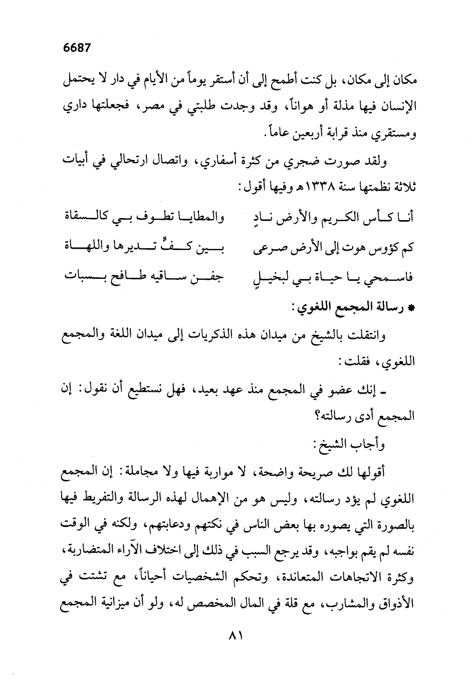 وانتقلت بالشيخ من ميدان هذه الذكريات إلى ميدان اللغة والمجمع اللغوي، فقلت:
