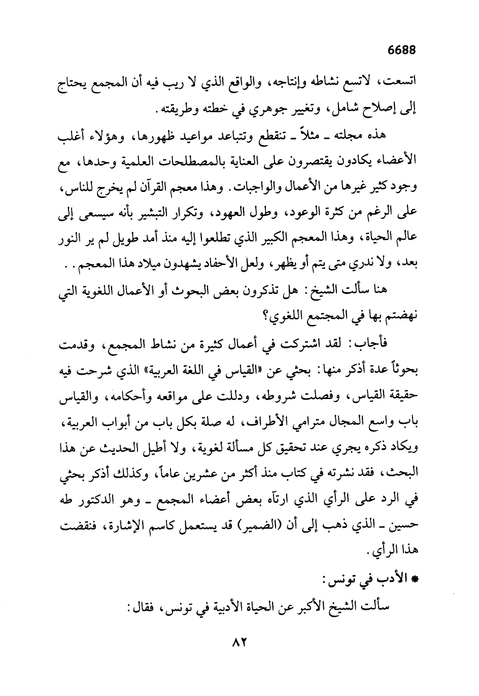فأجاب: لقد اشتركت في أعمال كثيرة من نشاط المجمع، وقدمت بحوثاً عدة أذكر منها: بحثي عن "القياس في اللغة العربية" الذي شرحت فيه حقيقة القياس، وفصلت شروطه، ودللت على مواقعه وأحكامه، والقياس باب واسع المجال مترامي الأطراف، له صلة بكل باب من أبواب العربية، ويكاد ذكره يجري عند تحقيق كل مسألة لغوية، ولا أطيل الحديث عن هذا البحث، فقد نشرته في كتاب منذ أكثر من عشرين عاماً، وكذلك أذكر بحثي في الرد على الرأي الذي ارتآه بعض أعضاء المجمع- وهو الدكتور طه حسين- الذي ذهب إلى أن (الضمير) قد يستعمل كاسم الإشارة، فنقضت هذا الرأي.