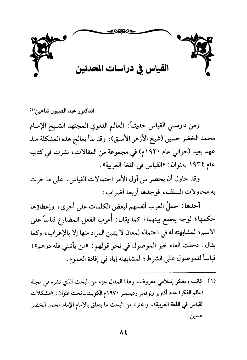 (¬1) كاتب ومفكر إسلامي معروف، وهذا المقال جزء من البحث الذي نشره في مجلة "عالم الفكر" عدد أكتوبر ونوفمبر وديسمبر 1970 م الكويت - تحت عنوان: "مشكلات القياس في اللغة العربية"، واخترنا من البحث ما يتعلق بالإمام الإمام محمد الخضر حسين.