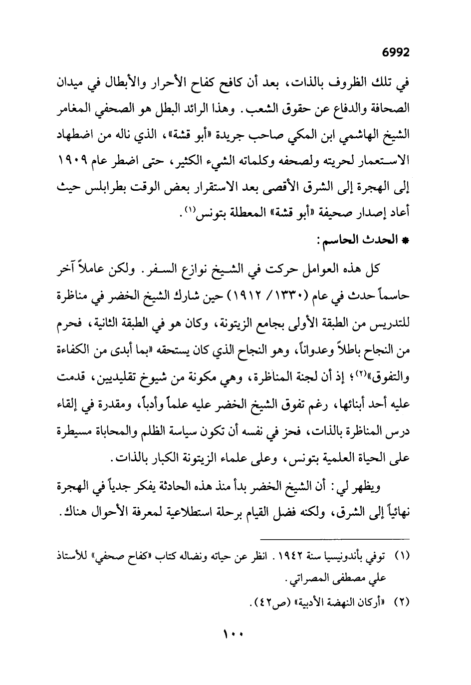 ويظهر لي: أن الشيخ الخضر بدأ منذ هذه الحادثة يفكر جدياً في الهجرة نهائياً إلى الشرق، ولكنه فضل القيام برحلة استطلاعية لمعرفة الأحوال هناك.