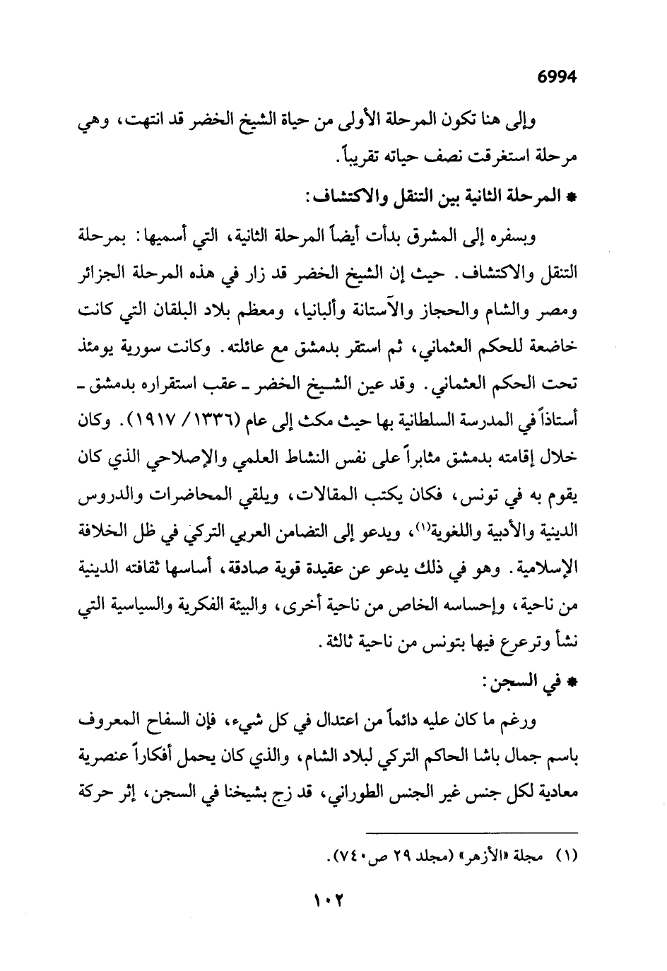 وبسفره إلى المشرق بدأت أيضاً المرحلة الثانية، التي أسميها: بمرحلة التنقل والاكتشاف. حيث إن الشيخ الخضر قد زار في هذه المرحلة الجزائر ومصر والشام والحجاز والآستانة وألبانيا، ومعظم بلاد البلقان التي كانت خاضعة للحكم العثماني، ثم استقر بدمشق مع عائلته. وكانت سورية يومئذ تحت الحكم العثماني. وقد عين الشيخ الخضر -عقب استقراره بدمشق- أستاذاً في المدرسة السلطانية بها حيث مكث إلى عام (1336/ 1917). وكان خلال إقامته بدمشق مثابراً على نفس النشاط العلمي والإصلاحي الذي كان يقوم به في تونس، فكان يكتب المقالات، ويلقي المحاضرات والدروس الدينية والأدبية واللغوية (¬1)، ويدعو إلى التضامن العربي التركي في ظل الخلافة الإسلامية. وهو في ذلك يدعو عن عقيدة قوية صادقة، أساسها ثقافته الدينية من ناحية، وإحساسه الخاص من ناحية أخرى، والبيئة الفكرية والسياسية التي نشأ وترعرع فيها بتونس من ناحية ثالثة.