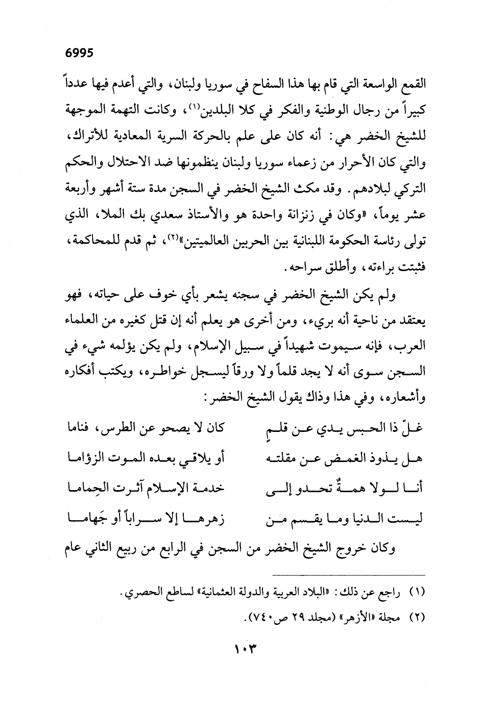 القمع الواسعة التي قام بها هذا السفاح في سوريا ولبنان، والتي أعدم فيها عدداً كبيراً من رجال الوطنية والفكر في كلا البلدين (¬1)، وكانت التهمة الموجهة للشيخ الخضر هي: أنه كان على علم بالحركة السرية المعادية للأتراك، والتي كان الأحرار من زعماء سوريا ولبنان ينظمونها ضد الاحتلال والحكم التركي لبلادهم. وقد مكث الشيخ الخضر في السجن مدة ستة أشهر وأربعة عشر يوماً، "وكان في زنزانة واحدة هو والأستاذ سعدي بك الملا، الذي تولى رئاسة الحكومة اللبنانية بين الحربين العالميتين" (¬2)، ثم قدم للمحاكمة، فثبتت براءته، وأطلق سراحه.