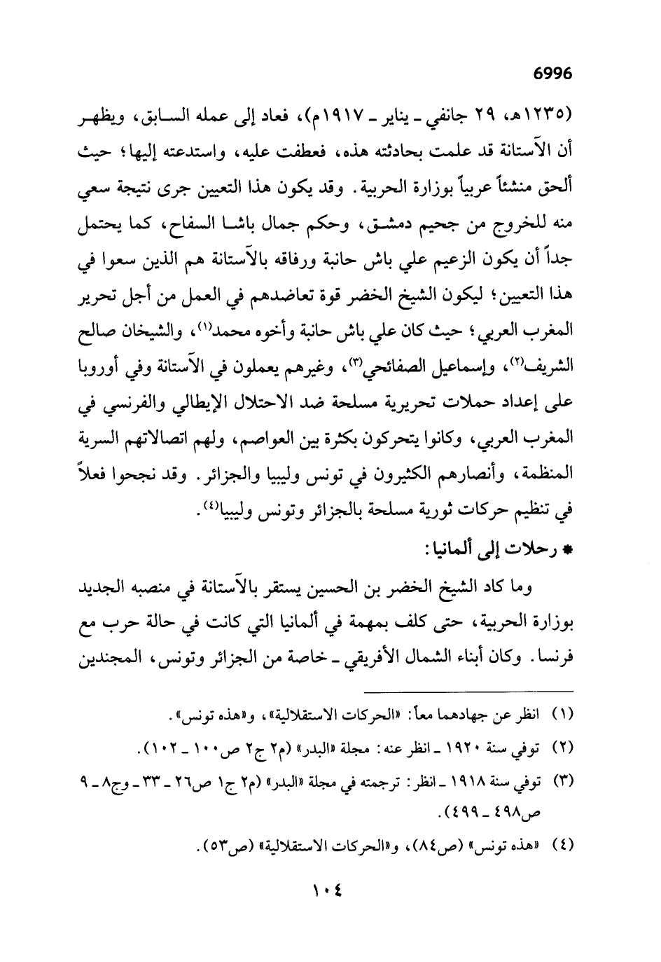 (1235 هـ، 29 جانفي - يناير - 1917 م)، فعاد إلى عمله السابق، ويظهر أن الآستانة قد علمت بحادثته هذه، فعطفت عليه، واستدعته إليها؛ حيث ألحق منشئاً عربياً بوزارة الحربية. وقد يكون هذا التعيين جرى نتيجة سعي منه للخروج من جحيم دمشق، وحكم جمال باشا السفاح، كما يحتمل جداً أن يكون الزعيم علي باش حانبة ورفاقه بالآستانة هم الذين سعوا في هذا التعيين؛ ليكون الشيخ الخضر قوة تعاضدهم في العمل من أجل تحرير المغرب العربي؛ حيث كان علي باش حانبة وأخوه محمد (¬1)، والشيخان صالح الشريف (¬2)، وإسماعيل الصفائحي (¬3)، وغيرهم يعملون في الآستانة وفي أوروبا على إعداد حملات تحريرية مسلحة ضد الاحتلال الإيطالي والفرنسي في المغرب العربي، وكانوا يتحركون بكثرة بين العواصم، ولهم اتصالاتهم السرية المنظمة، وأنصارهم الكثيرون في تونس وليبيا والجزائر. وقد نجحوا فعلاً في تنظيم حركات ثورية مسلحة بالجزائر وتونس وليبيا (¬4).