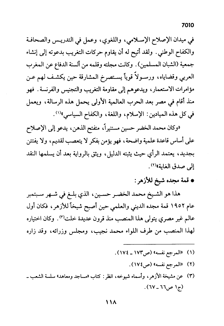 هذا هو الشيخ محمد الخضر حسين، الذي بلغ في شهر سبتمبر عام 1952 قمة مجده الديني والعلمي حين أصبح شيخاً للأزهر، فكان أول عالم غير مصري يتولى هذا المنصب منذ قرون عديدة خلت (¬3). وكان اختياره لهذا المنصب من طرف اللواء محمد نجيب، ومجلس وزرائه، وقد زاره