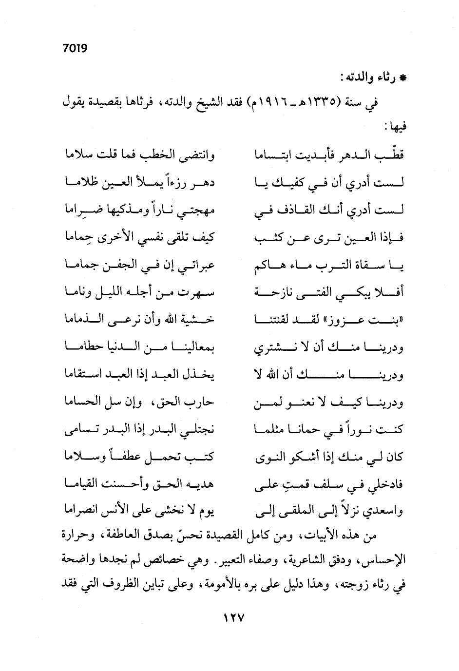 في سنة (1335 هـ - 1916 م) فقد الشيخ والدته، فرثاها بقصيدة يقول فيها: