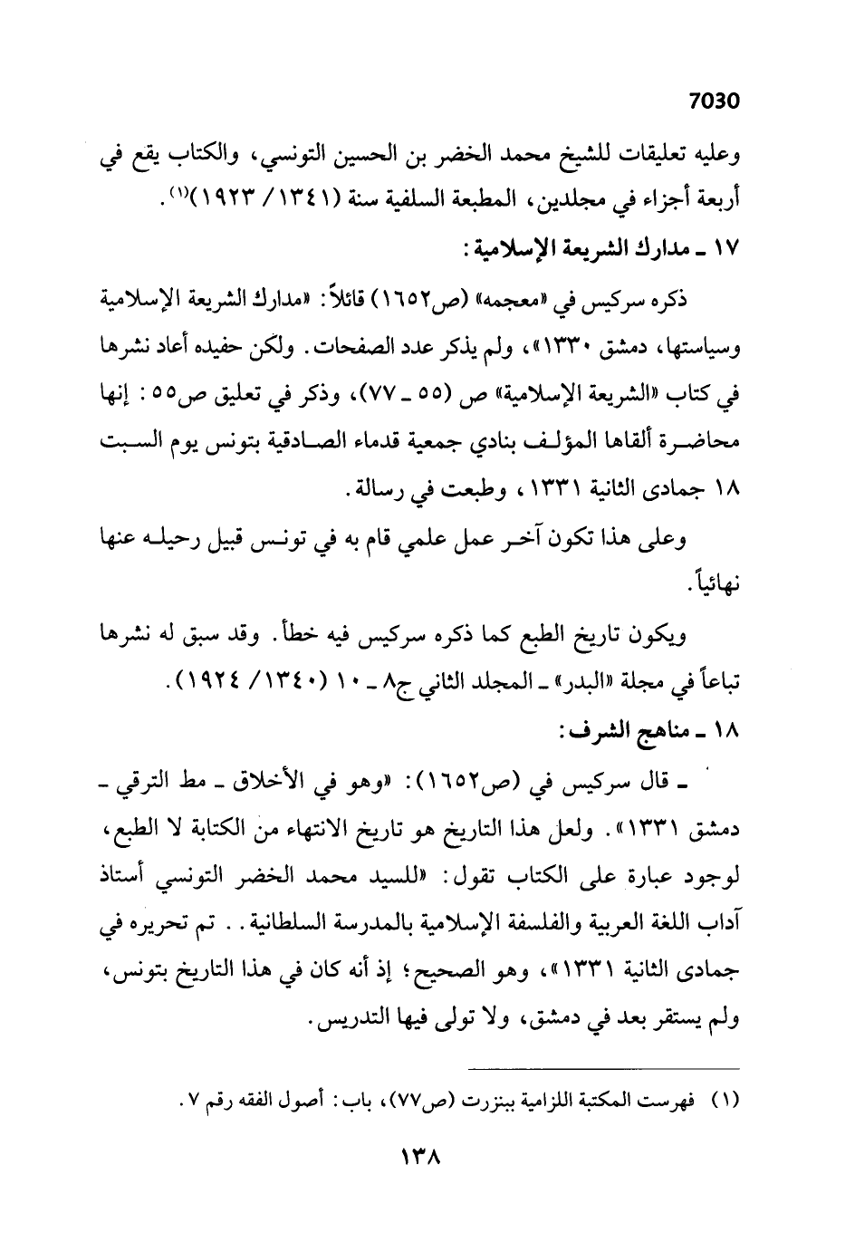 - قال سركيس في (ص 1652): "وهو في الأخلاق -مط الترقي- دمشق 1331". ولعل هذا التاريخ هو تاريخ الانتهاء من الكتابة لا الطبع، لوجود عبارة على الكتاب تقول: "للسيد محمد الخضر التونسي أستاذ آداب اللغة العربية والفلسفة الإسلامية بالمدرسة السلطانية. . تم تحريره في جمادى الثانية 1331"، وهو الصحيح؛ إذ أنه كان في هذا التاريخ بتونس، ولم يستقر بعد في دمشق، ولا تولى فيها التدريس.