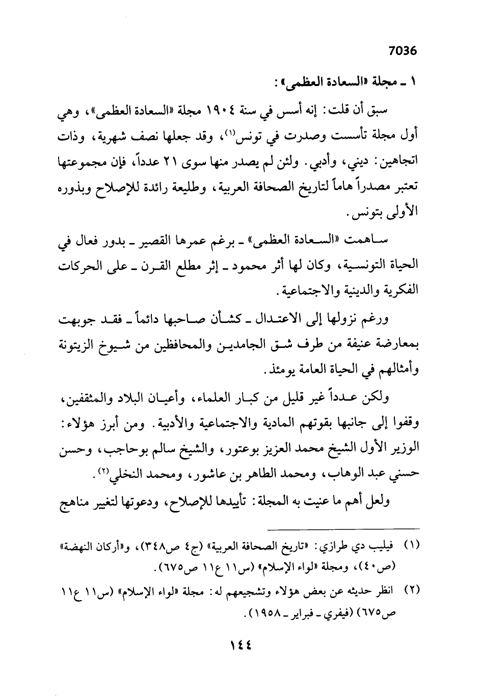 سبق أن قلت: إنه أسس في سنة 1904 مجلة "السعادة العظمى"، وهي أول مجلة تأسست وصدرت في تونس (¬1)، وقد جعلها نصف شهرية، وذات اتجاهين: ديني، وأدبي. ولئن لم يصدر منها سوى 21 عدداً، فإن مجموعتها تعتبر مصدراً هاماً لتاريخ الصحافة العربية، وطليعة رائدة للإصلاح وبذوره الأولى بتونس.