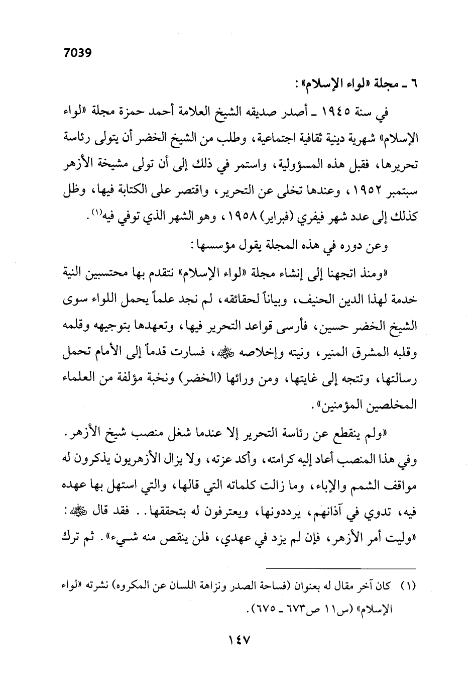 "ومنذ اتجهنا إلى إنشاء مجلة "لواء الإسلام" نتقدم بها محتسبين النية خدمة لهذا الدين الحنيف، وبياناً لحقائقه، لم نجد علماً يحمل اللواء سوى الشيخ الخضر حسين، فأرسى قواعد التحرير فيها، وتعهدها بتوجيهه وقلمه وقلبه المشرق المنير، ونيته وإخلاصه - صلى الله عليه وسلم -، فسارت قدماً إلى الأمام تحمل رسالتها، وتتجه إلى غايتها، ومن ورائها (الخضر) ونخبة مؤلفة من العلماء المخلصين المؤمنين".