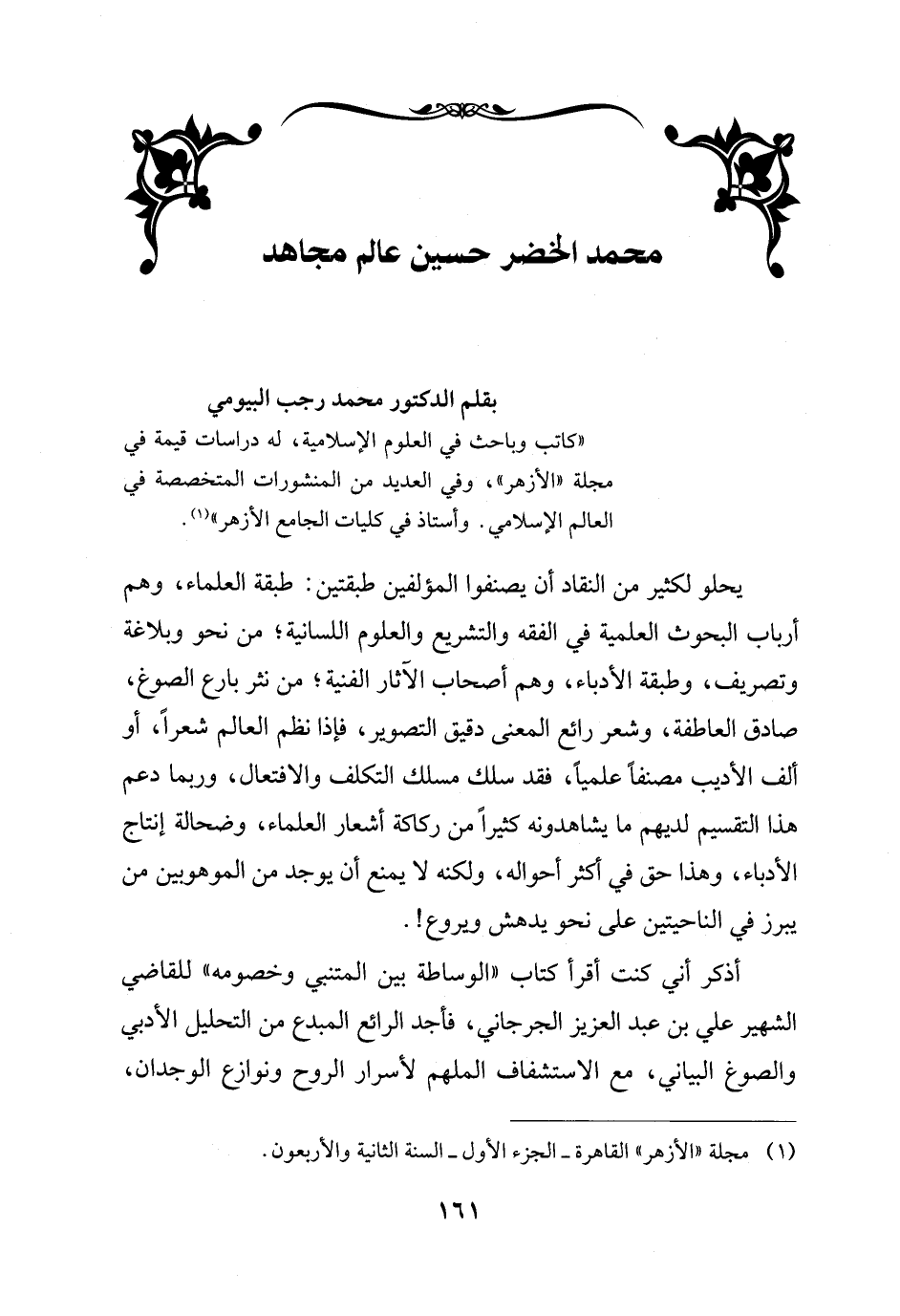 أذكر أني كنت أقرأ كتاب "الوساطة بين المتنبي وخصومه" للقاضي الشهير علي بن عبد العزيز الجرجاني، فأجد الرائع المبدع من التحليل الأدبي والصوغ البياني، مع الاستشفاف الملهم لأسرار الروح ونوازع الوجدان،