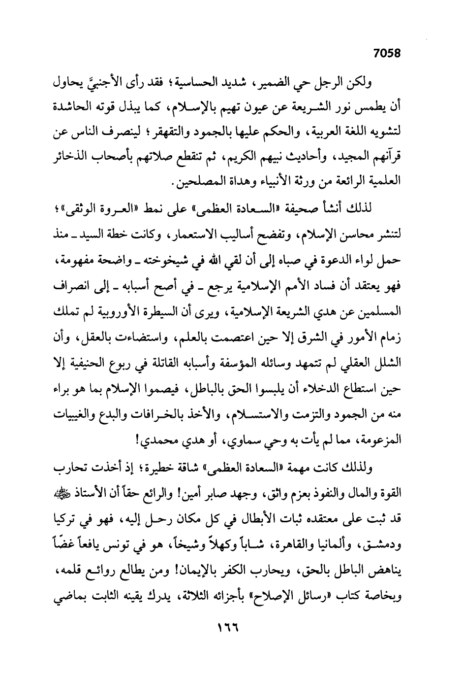 ولذلك كانت مهمة "السعادة العظمى" شاقة خطيرة؛ إذ أخذت تحارب القوة والمال والنفوذ بعزم وأثق، وجهد صابر أمين! والرائع حقاً أن الأستاذ - رضي الله عنه - قد ثبت على معتقده ثبات الأبطال في كل مكلان رحل إليه، فهو في تركيا ودمشق، وألمانيا والقاهرة، شاباً وكهلاً وشيخاً، هو في تونس يافعاً غضّاً يناهض الباطل بالحق، ويحارب الكفر بالإيمان! ومن يطالع روائع قلمه، وبخاصة كتاب "رسائل الإصلاح" بأجزائه الثلاثة، يدرك يقينه الثابت بماضي