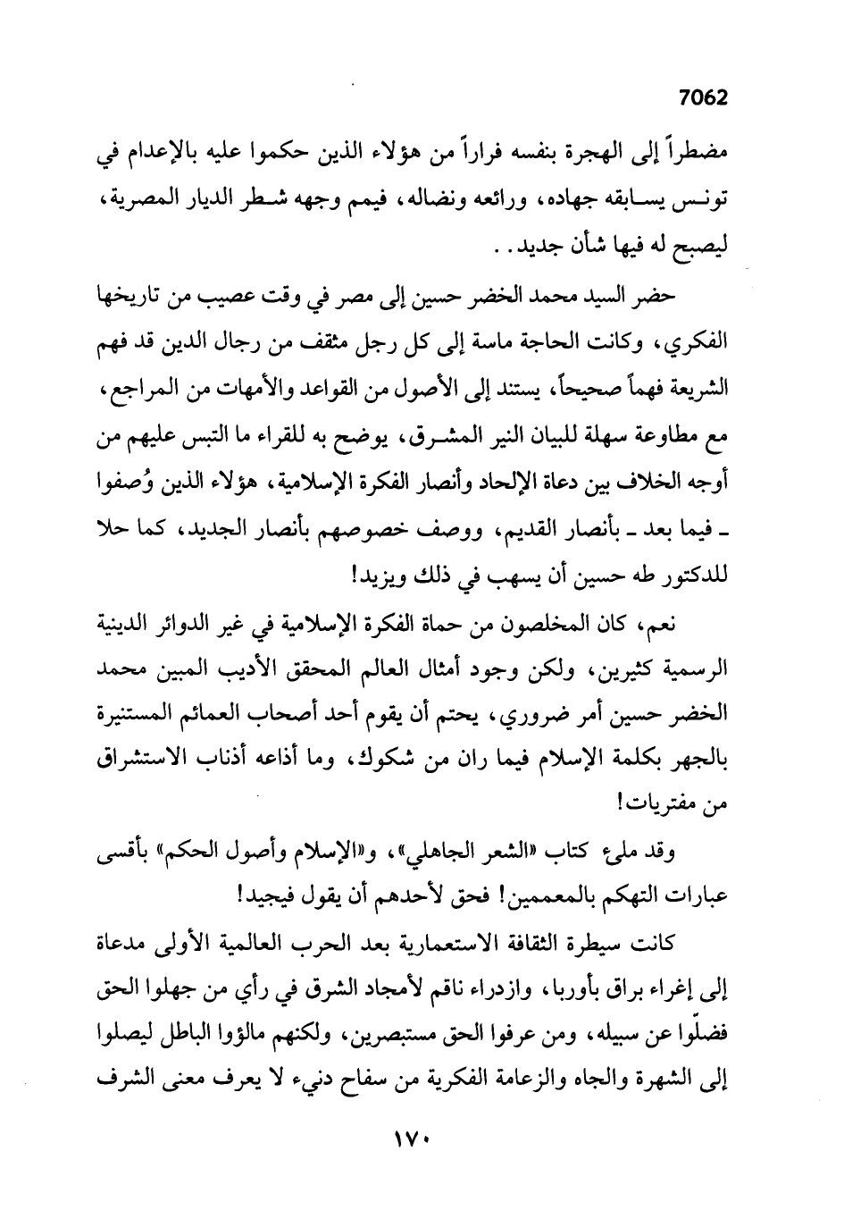 نعم، كان المخلصون من حماة الفكرة الإسلامية في غير الدوائر الدينية الرسمية كثيرين، ولكن وجود أمثال العالم المحقق الأديب المبين محمد الخضر حسين أمر ضروري، يحتم أن يقوم أحد أصحاب العمائم المستنيرة بالجهر بكلمة الإسلام فيما ران من شكوك، وما أذاعه أذناب الاستشراق من مفتريات!