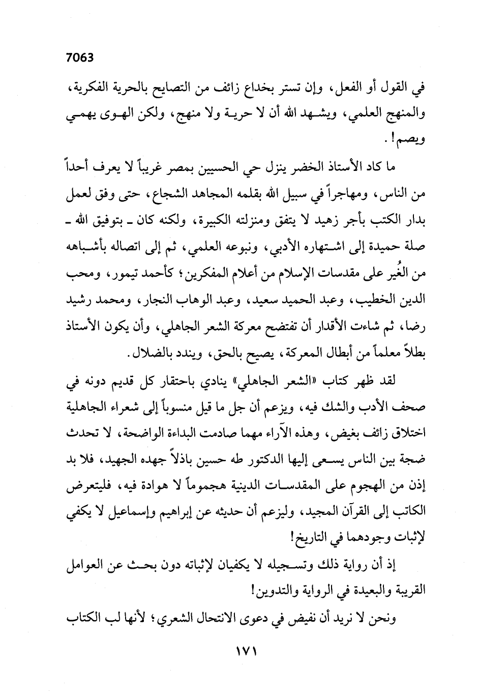 لقد ظهر كتاب "الشعر الجاهلي" ينادي باحتقار كل قديم دونه في صحف الأدب والشك فيه، ويزعم أن جل ما قيل منسوباً إلى شعراء الجاهلية اختلاق زائف بغيض، وهذه الآراء مهما صادمت البداءة الواضحة، لا تحدث ضجة بين الناس يسعى إليها الدكتور طه حسين باذلاً جهده الجهيد، فلا بد إذن من الهجوم على المقدسات الدينية هجموماً لا هوادة فيه، فليتعرض الكاتب إلى القرآن المجيد، وليزعم أن حديثه عن إبراهيم وإسماعيل لا يكفي لإثبات وجودهما في التاريخ!