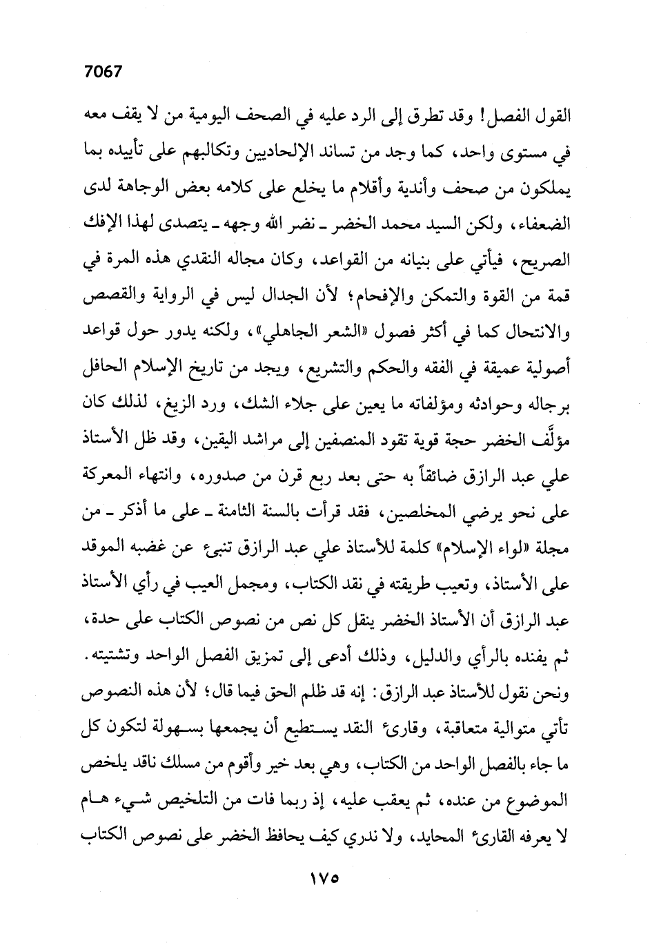 القول الفصل! وقد تطرق إلى الرد عليه في الصحف اليومية من لا يقف معه في مستوى واحد، كما وجد من تساند الإلحاديين وتكالبهم على تأييده بما يملكون من صحف وأندية وأقلام ما يخلع على كلامه بعض الوجاهة لدى الضعفاء، ولكن السيد محمد الخضر -نضر الله وجهه- يتصدى لهذا الإفك الصريح، فيأتي على بنيانه من القواعد، وكان مجاله النقدي هذه المرة في قمة من القوة والتمكن والإفحام؛ لأن الجدال ليس في الرواية والقصص والانتحال كما في أكثر فصول "الشعر الجاهلي"، ولكنه يدور حول قواعد أصولية عميقة في الفقه والحكم والتشريع، ويجد من تاريخ الإسلام الحافل برجاله وحوادثه ومؤلفاته ما يعين على جلاء الشك، ورد الزيغ، لذلك كان مؤلَّف الخضر حجة قوية تقود المنصفين إلى مراشد اليقين، وقد ظل الأستاذ علي عبد الرازق ضائقاً به حتى بعد ربع قرن من صدوره، وانتهاء المعركة على نحو يرضي المخلصين، فقد قرأت بالسنة الثامنة -على ما أذكر- من مجلة "لواء الإسلام" كلمة للأستاذ علي عبد الرازق تنبئ عن غضبه الموقد على الأستاذ، وتعيب طريقته في نقد الكتاب، ومجمل العيب في رأيي الأستاذ عبد الرازق أن الأستاذ الخضر ينقل كل نص من نصوص الكتاب على حدة، ثم يفنده بالرأي والدليل، وذلك أدعى إلى تمزيق الفصل الواحد وتشتيته. ونحن نقول للأستاذ عبد الرازق: إنه قد ظلم الحق فيما قال؛ لأن هذه النصوص تأتي متوالية متعاقبة، وقارئ النقد يستطيع أن يجمعها بسهولة لتكون كل ما جاء بالفصل الواحد من الكتاب، وهي بعد خير وأقوم من مسلك ناقد يلخص الموضوع من عنده، ثم يعقب عليه، إذ ربما فات من التلخيص شيء هام لا يعرفه القارئ المحايد، ولا ندري كيف يحافظ الخضر على نصوص الكتاب