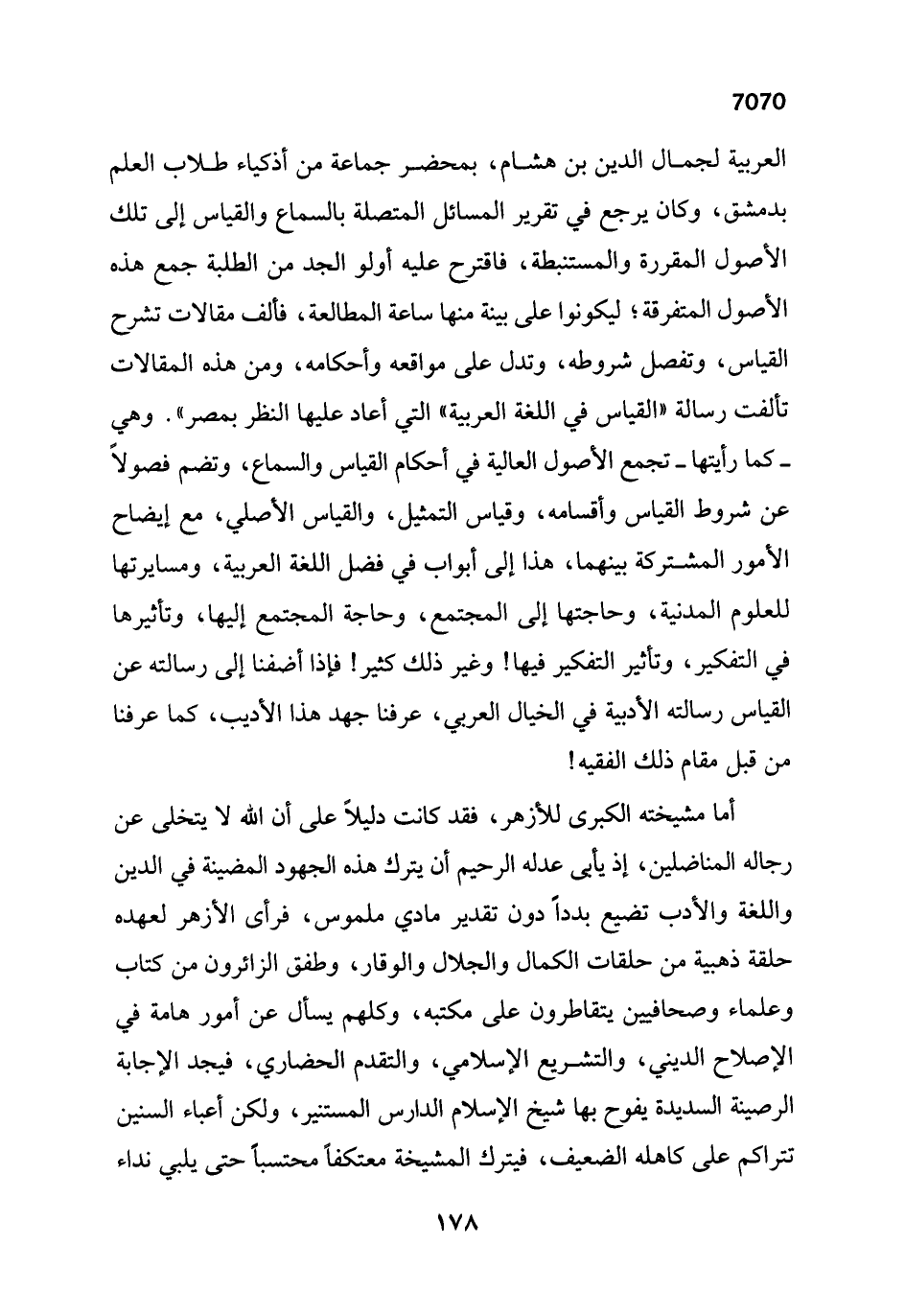 العربية لجمال الدين بن هشام، بمحضر جماعة من أذكياء طلاب العلم بدمشق، وكان يرجع في تقرير المسائل المتصلة بالسماع والقياس إلى تلك الأصول المقررة والمستنبطة، فاقترح عليه أولو الجد من الطلبة جمع هذه الأصول المتفرقة؛ ليكونوا على بينة منها ساعة المطالعة، فألف مقالات تشرح القياس، وتفصل شروطه، وتدل على مواقعه وأحكامه، ومن هذه المقالات تألفت رسالة "القياس في اللغة العربية" التي أعاد عليها النظر بمصر". وهي -كما رأيتها- تجمع الأصول العالية في أحكام القياس والسماع، وتضم فصولاً عن شروط القياس وأقسامه، وقياس التمثيل، والقياس الأصلي، مع إيضاح الأمور المشتركة بينهما، هذا إلى أبواب في فضل اللغة العربية، ومسايرتها للعلوم المدنية، وحاجتها إلى المجتمع، وحاجة المجتمع إليها، وتأثيرها في التفكير، وتأير التفكير فيها! وغير ذلك كثير! فإذا أضفنا إلى رسالته عن القياس رسالته الأدبية في الخيال العربي، عرفنا جهد هذا الأديب، كما عرفنا من قبل مقام ذلك الفقيه!