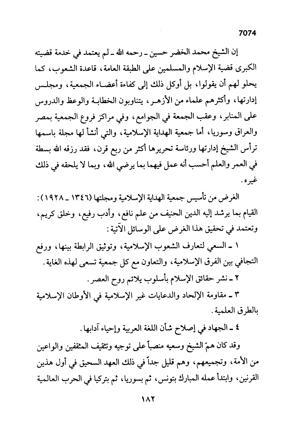 إن الشيخ محمد الخضر حسين -رحمه الله- لم يعتمد في خدمة قضيته الكبرى قضية الإسلام والمسلمين على الطبقة العامة، قاعدة الشعوب، كما يحلو لهم أن يقولوا، بل أوكل ذلك إلى كفاءة أعضاء الجمعية، ومجلس إدارتها، وكثرهم علماء من الأزهر، يتناوبون الخطابة والوعظ والدروس على المنابر، وعقب الجمعة في الجوامع، وفي مراكز فروع الجمعية بمصر والعراق وسوريا، أما جمعية الهداية الإسلامية، والتي أنشأ لها مجلة باسمها ترأس الشيخ إدارتها ورئاسة تحريرها أكثر من ربع قرن، فقد رزقه الله بسطة في العمر والعلم أحسب أنه عمل فيهما بما يرضي الله، وبما لا يلحقه في ذلك غيره.