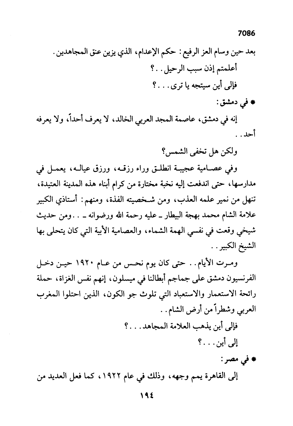 ومرت الأيام .. حتى كان يوم نحس من عام 1920 حين دخل الفرنسيون دمشق على جماجم أبطالنا في ميسلون، إنهم نفس الغزاة، حملة رائحة الاستعمار والاستعباد التي تلوث جو الكون، الذين احتلوا المغرب العربي وشطراً من أرض الشام ..
