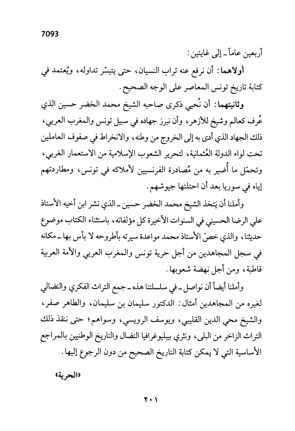 وأملنا أيضاً أن نواصل -في سلسلتنا هذه- جمع التراث الفكري والنضالي لغيره من المجاهدين أمثال: الدكتور سليمان بن سليمان، والطاهر صفر، والشيخ محيي الدين القليبي، ويوسف الرويسي، وسواهم؛ حتى ننقذ ذلك التراث الزاخر من البلى، ونثري بيبليوغرافيا النضال والتاريخ الوطنيين بالمراجع الأساسية التي لا يمكن كتابة التاريخ الصحيح من دون الرجوع إليها. "الحرية"
