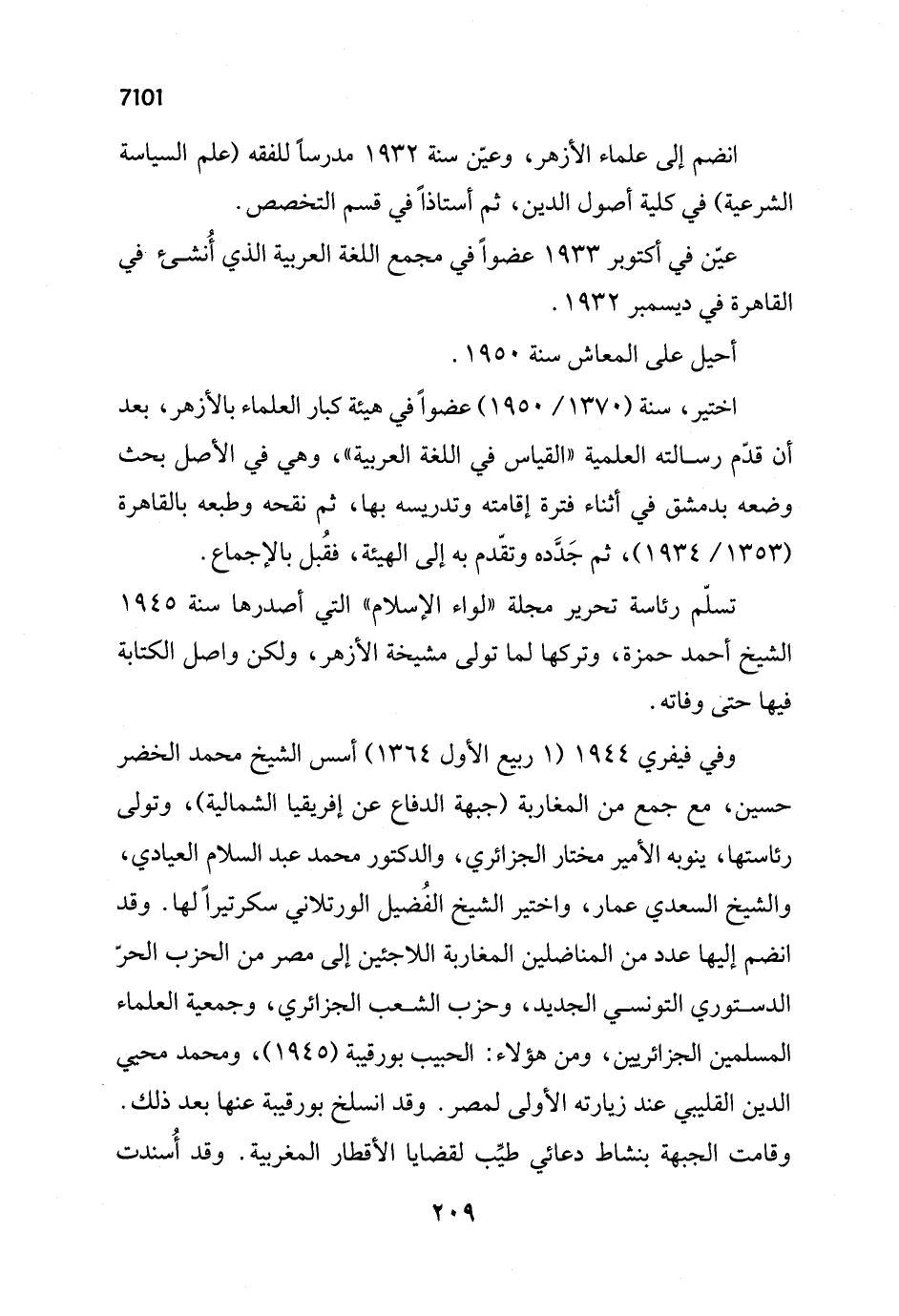وفي فيفري 1944 (1 ربيع الأول 1364) أسس الشيخ محمد الخضر حسين، مع جمع من المغاربة (جبهة الدفاع عن إفريقيا الشمالية)، وتولى رئاستها، ينوبه الأمير مختار الجزائري، والدكتور محمد عبد السلام العيادي، والشيخ السعدي عمار، واختير الشيخ الفُضيل الورتلاني سكرتيراً لها. وقد انضم إليها عدد من المناضلين المغاربة اللاجئين إلى مصر من الحزب الحرّ الدستوري التونسي الجديد، وحزب الشعب الجزائري، وجمعية العلماء المسلمين الجزائريين، ومن هؤلاء: الحبيب بورقيبة (1945)، ومحمد محيي الدين القليبي عند زيارته الأولى لمصر. وقد انسلخ بورقيبة عنها بعد ذلك. وقامت الجبهة بنشاط دعائي طيِّب لقضايا الأقطار المغربية. وقد أُسندت