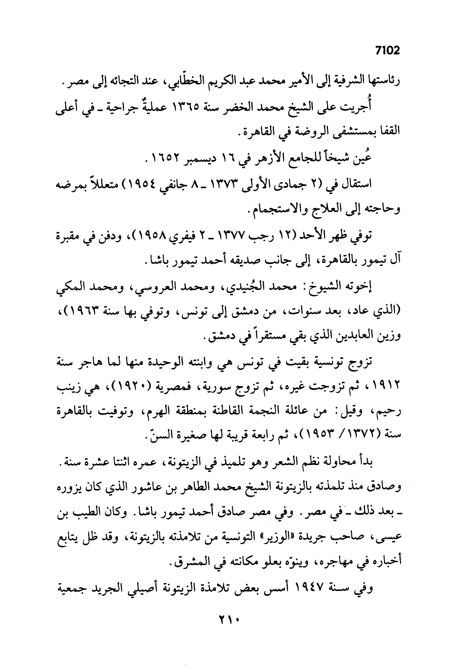 إخوته الشيوخ: محمد الجُنيدي، ومحمد العروسي، ومحمد المكي (الذي عاد، بعد سنوات، من دمشق إلى تونس، وتوفي بها سنة 1963)، وزين العابدين الذي بقي مستقراً في دمشق.