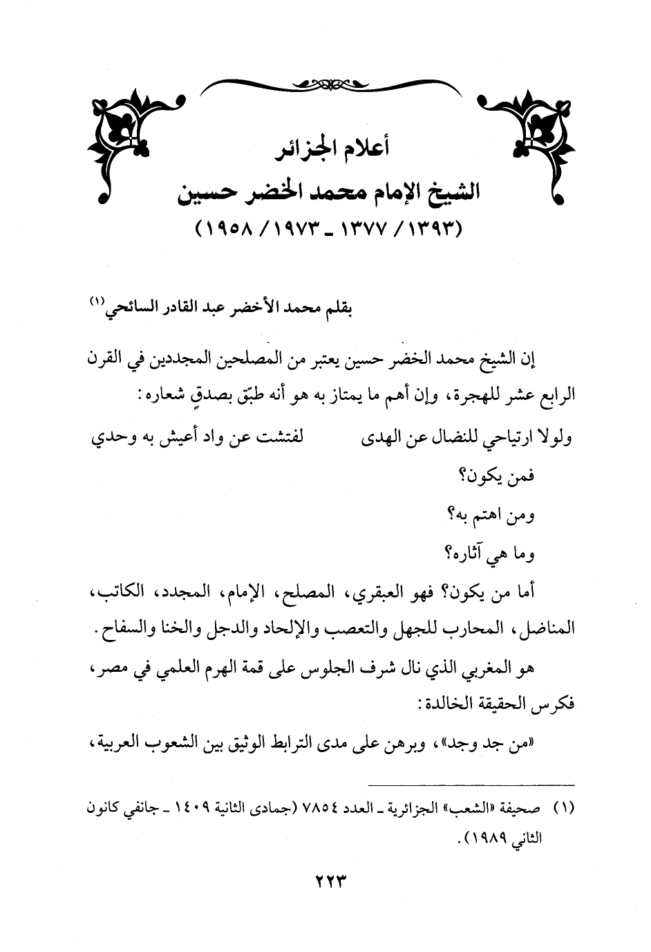 (¬1) صحيفة "الشعب" الجزائرية - العدد 7854 (جمادى الثانية 1409 - جانفي كانون الثاني 1989).