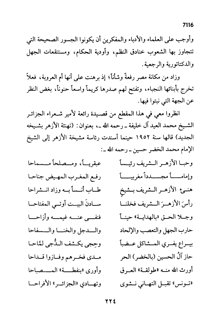 انظروا معي في هذا المقطع من قصيدة رائعة لأمير شعراء الجزائر الشيخ محمد العيد آل خليفة -رحمه الله-، بعنوان: (تهنئة الأزهر بشيخه الجديد) قالها سنة 1952 حينما أسندت رئاسة مشيخة الأزهر إلى الشيخ الإِمام محمد الخضر حسين -رحمه الله-: