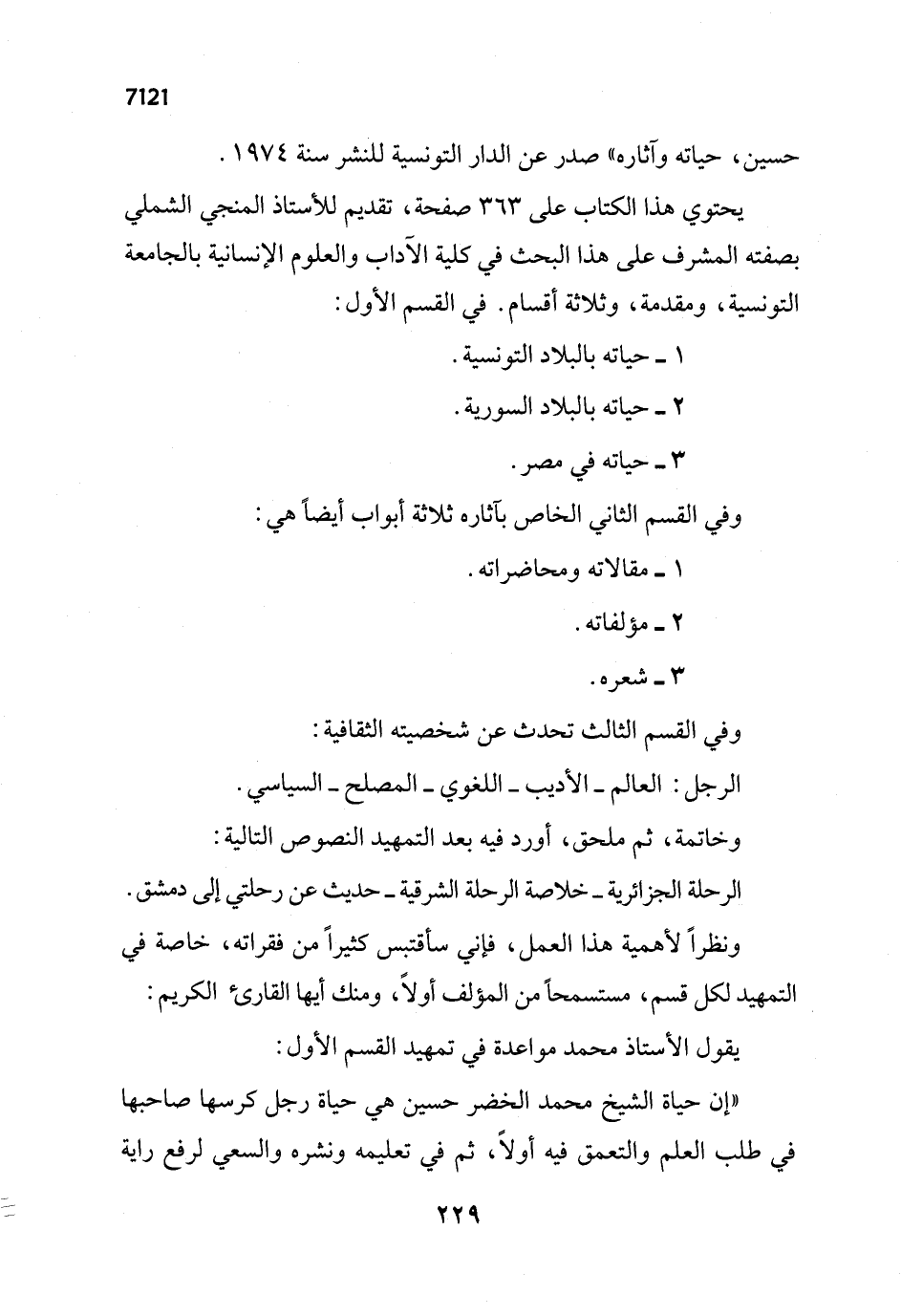 "إن حياة الشيخ محمد الخضر حسين هي حياة رجل كرسها صاحبها في طلب العلم والتعمق فيه أولاً، ثم في تعليمه ونشره والسعي لرفع راية