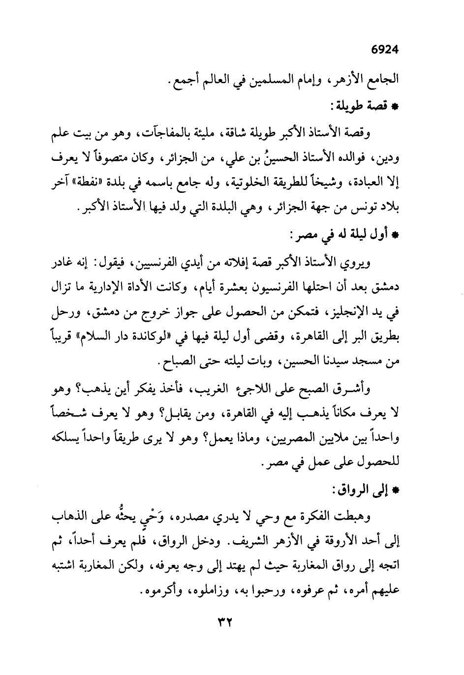 وهبطت الفكرة مع وحي لا يدري مصدره، وَحْيٍ يحثُّه على الذهاب إلى أحد الأروقة في الأزهر الشريف. ودخل الرواق، فلم يعرف أحداً، ثم اتجه إلى رواق المغاربة حيث لم يهتد إلى وجه يعرفه، ولكن المغاربة اشتبه عليهم أمره، ثم عرفوه، ورحبوا به، وزاملوه، وأكرموه.