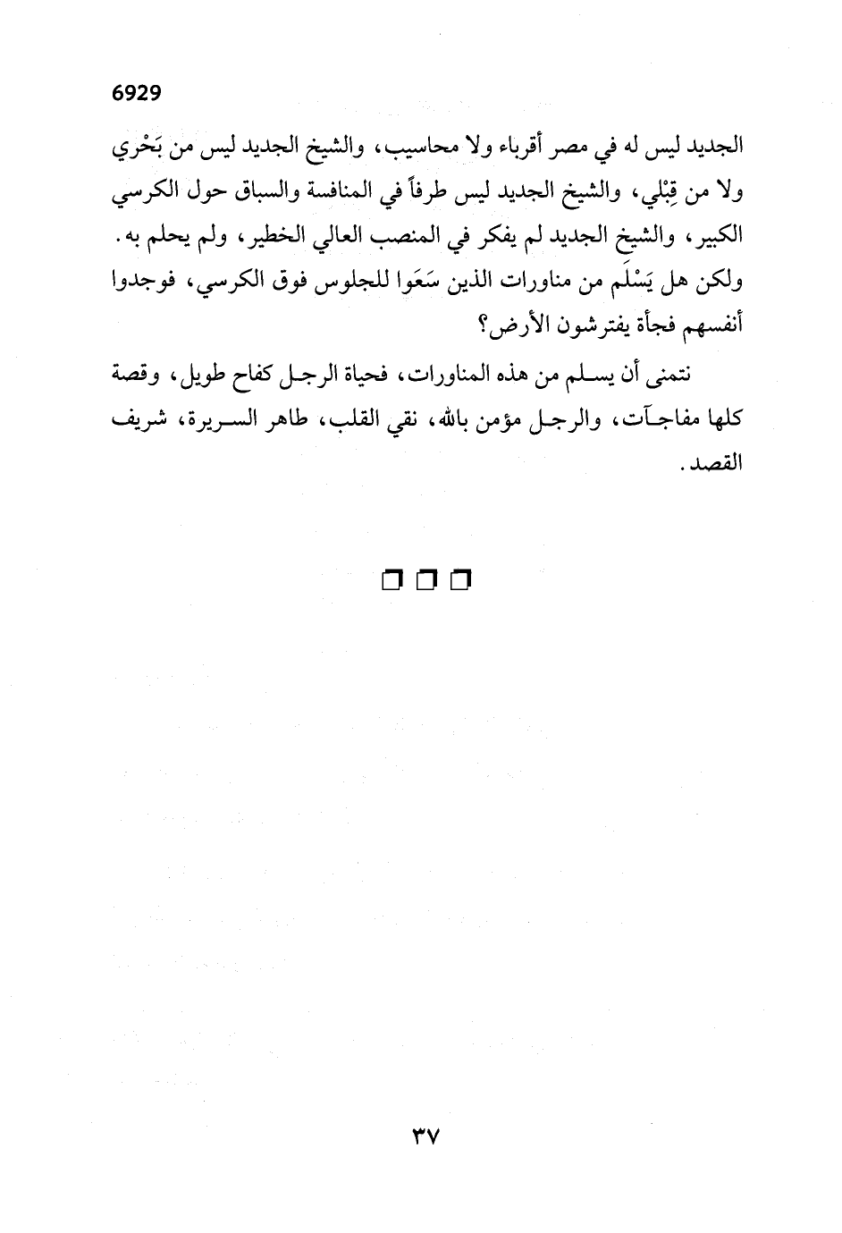 الجديد ليس له في مصر أقرباء ولا محاسيب، والشيخ الجديد ليس من بَحْري ولا من قِبْلي، والشيخ الجديد ليس طرفاً في المنافسة والسباق حول الكرسي الكبير، والشيخ الجديد لم يفكر في المنصب العالي الخطير، ولم يحلم به. ولكن هل يَسْلَم من مناورات الذين سَعَوا للجلوس فوق الكرسي، فوجدوا أنفسهم فجأة يفترشون الأرض؟