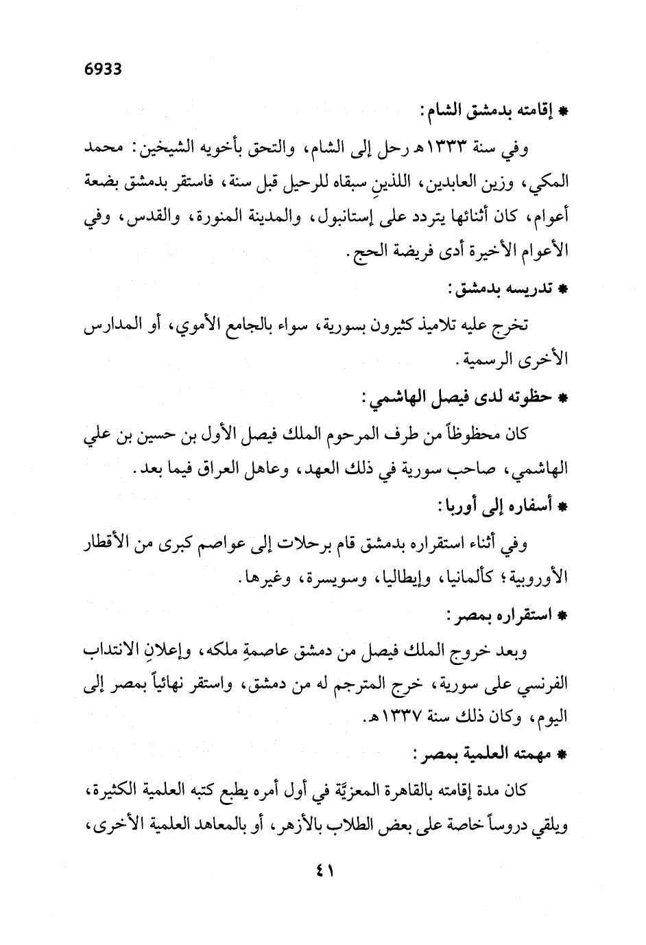 وبعد خروج الملك فيصل من دمشق عاصمةِ ملكه، وإعلانِ الانتداب الفرنسي على سورية، خرج المترجم له من دمشق، واستقر نهائياً بمصر إلى اليوم، وكان ذلك سنة 1337 هـ.