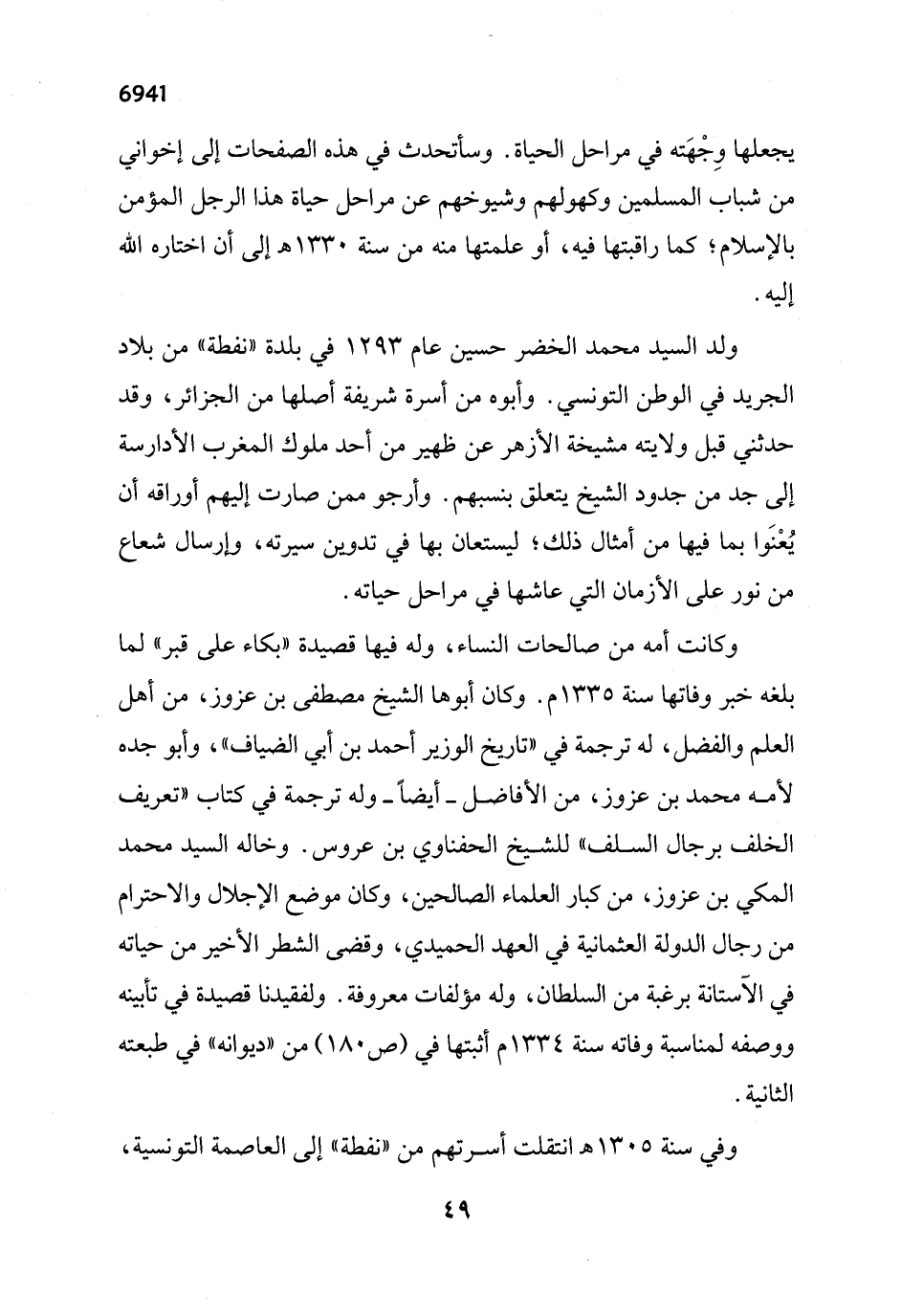 ولد السيد محمد الخضر حسين عام 1293 في بلدة "نفطة" من بلاد الجريد في الوطن التونسي. وأبوه من أسرة شريفة أصلها من الجزائر، وقد حدثني قبل ولايته مشيخة الأزهر عن ظهير من أحد ملوك المغرب الأدارسة إلى جد من جدود الشيخ يتعلق بنسبهم. وأرجو ممن صارت إليهم أوراقه أن يُعْنَوا بما فيها من أمثال ذلك؛ ليستعان بها في تدوين سيرته، وإرسال شعاع من نور على الأزمان التي عاشها في مراحل حياته.