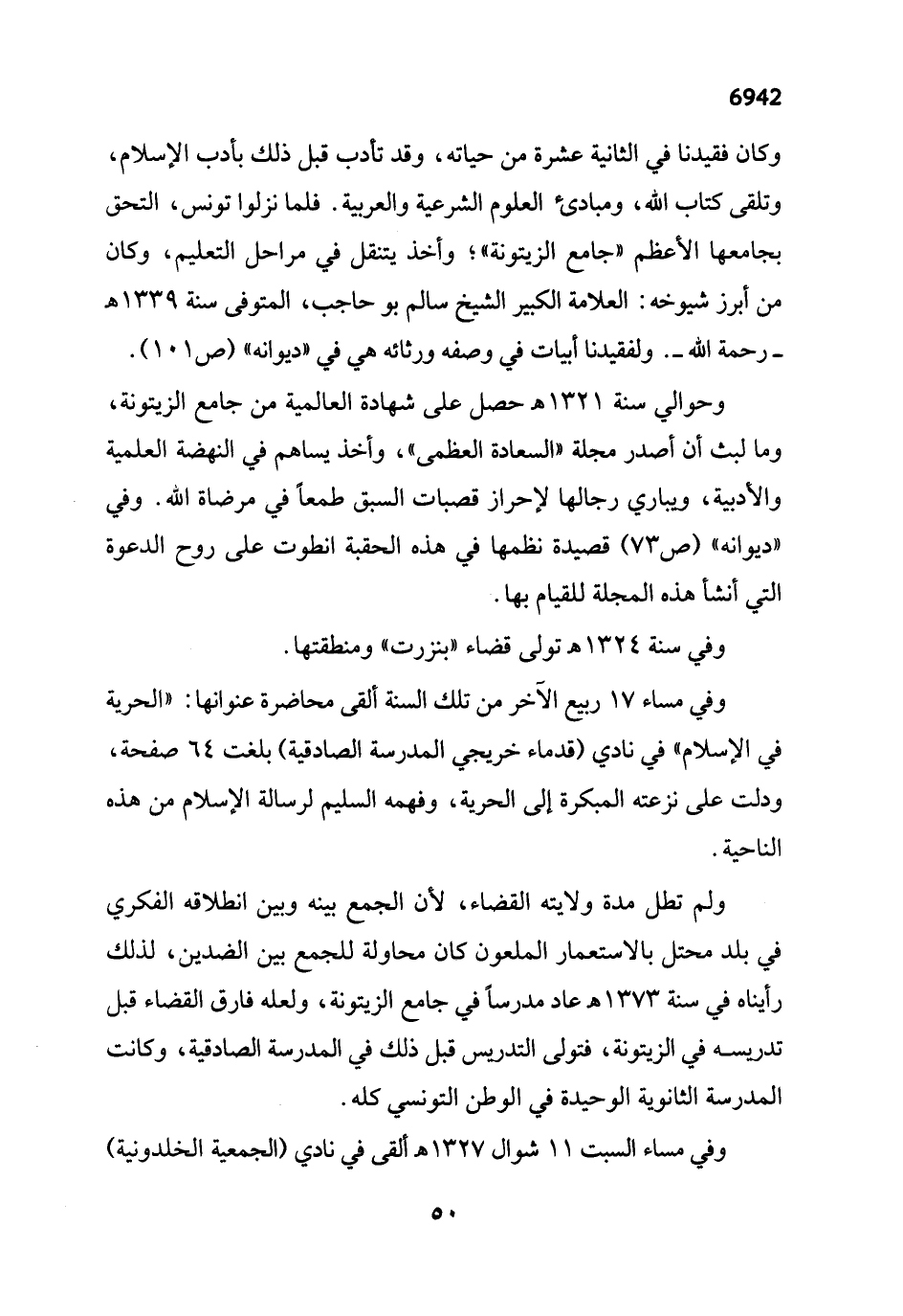وكان فقيدنا في الثانية عشرة من حياته، وقد تأدب قبل ذلك بأدب الإِسلام، وتلقى كتاب الله، ومبادئ العلوم الشرعية والعربية. فلما نزلوا تونس، التحق بجامعها الأعظم "جامع الزيتونة"؛ وأخذ يتنقل في مراحل التعليم، وكان من أبرز شيوخه: العلامة الكبير الشيخ سالم بو حاجب، المتوفى سنة 1339 هـ -رحمه الله-. ولفقيدنا أبيات في وصفه ورثائه هي في "ديوانه" (ص 101).