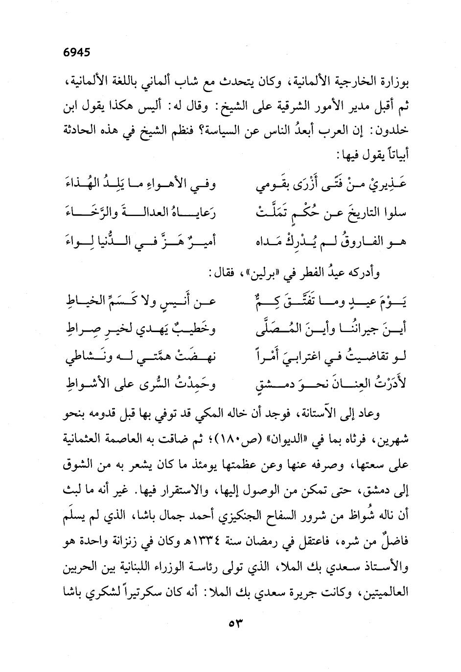 بوزارة الخارجية الألمانية، وكان يتحدث مع شاب ألماني باللغة الألمانية، ثم أقبل مدير الأمور الشرقية على الشيخ: وقال له: أليس هكذا يقول ابن خلدون: إن العرب أبعدُ الناس عن السياسة؛ فنظم الشيخ في هذه الحادثة أبياتاً يقول فيها: